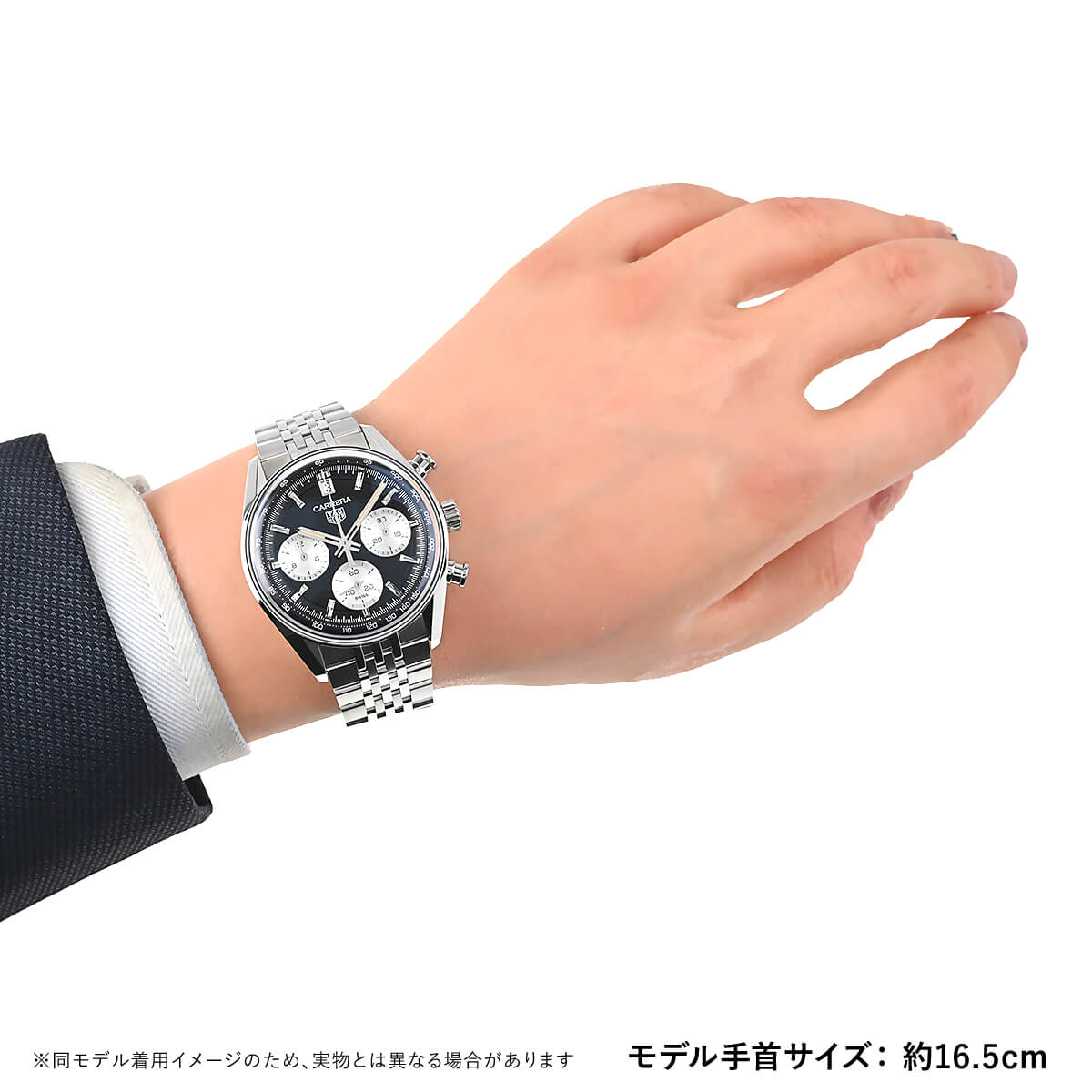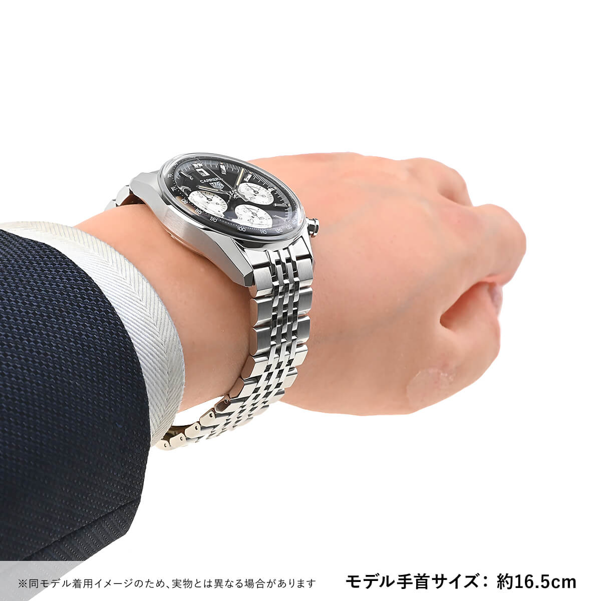 あえてタキメーターベゼルを外すことでシンプルでドレッシーな印象となっていますので、スーツスタイルにも合わせやすいクロノグラフです。