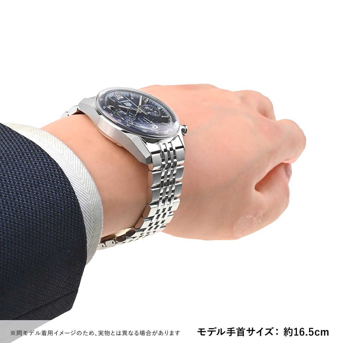 あえてタキメーターベゼルを外すことでシンプルでドレッシーな印象となっていますので、スーツスタイルにも合わせやすいクロノグラフです。