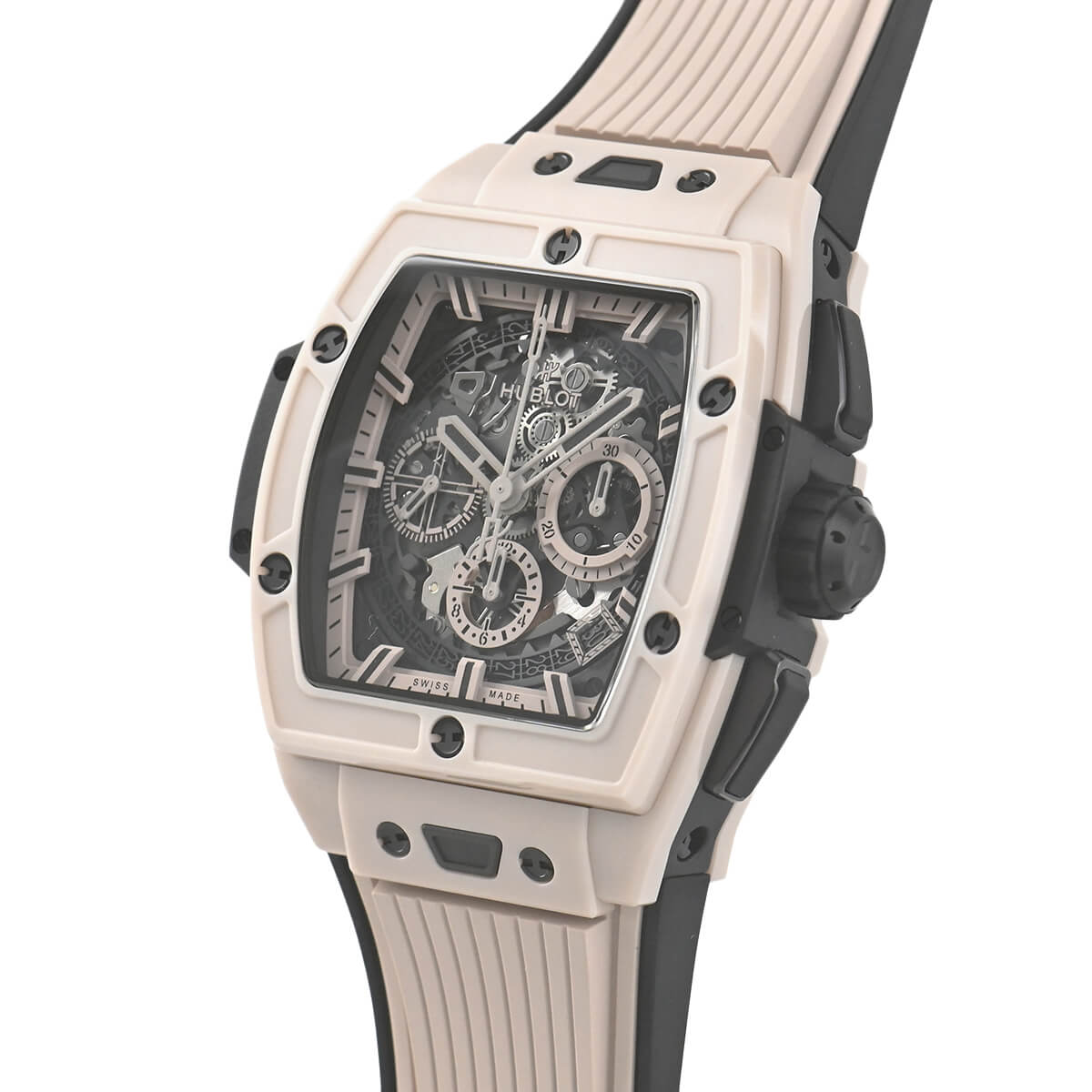 全く新しいトノーケースを備えた「スピリットオブビッグバン」。従来のビッグバンシリーズと意匠は異なりますが、「スピリットオブビッグバンベージュセラミック」の名前が示すように、その魂は受け継がれています。