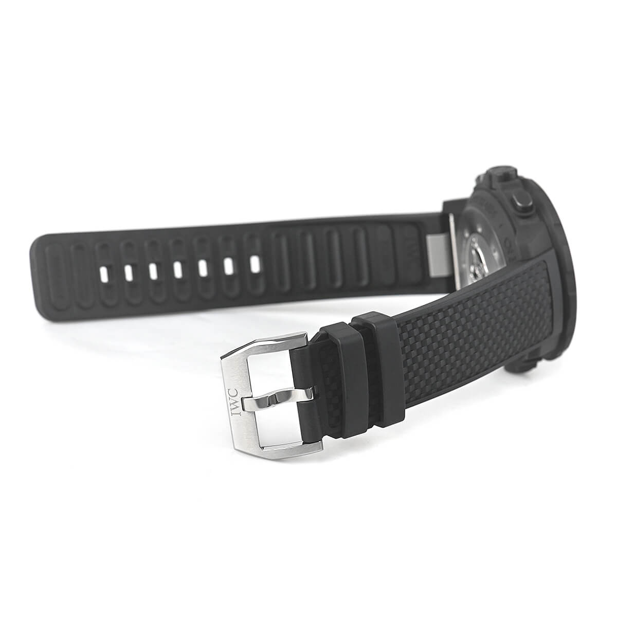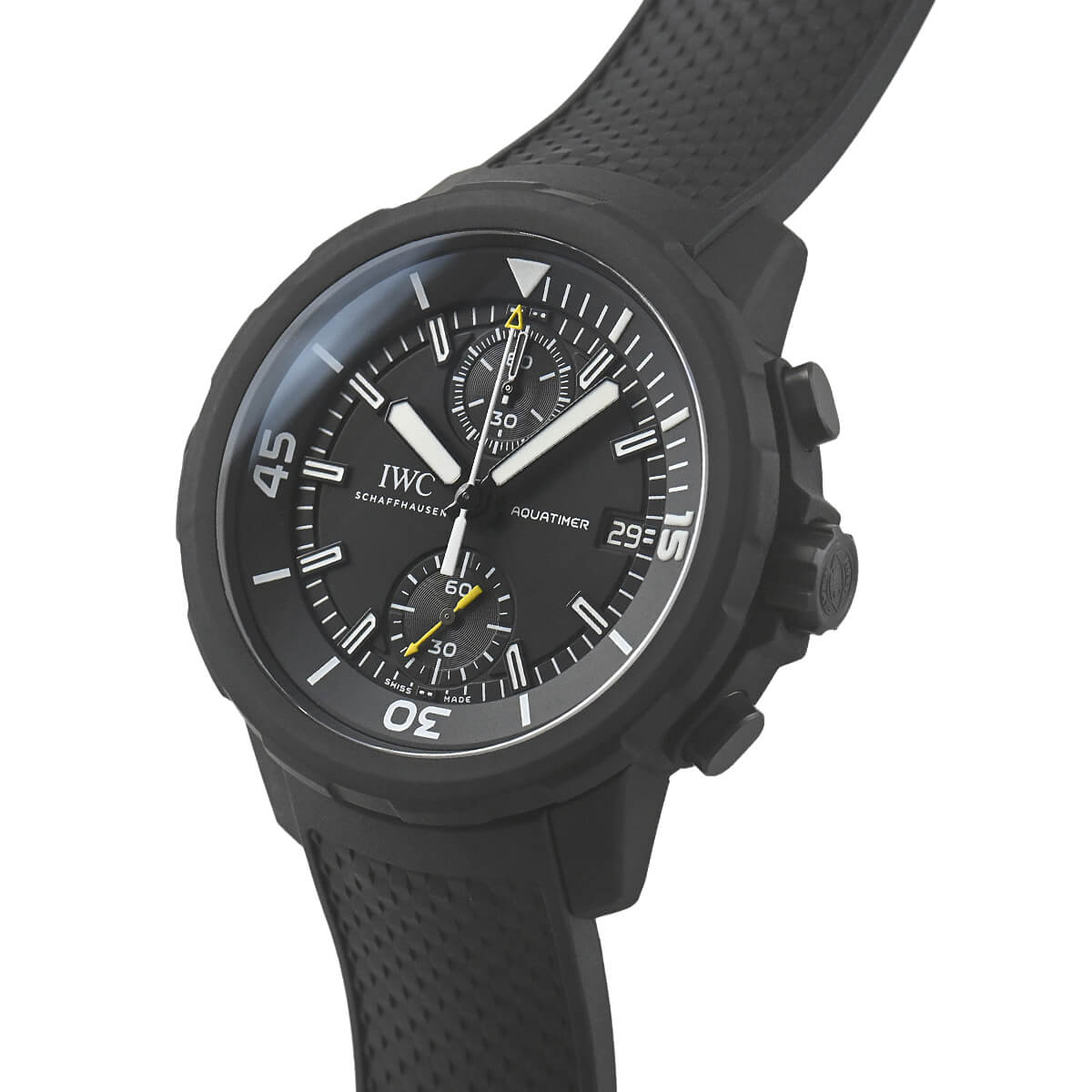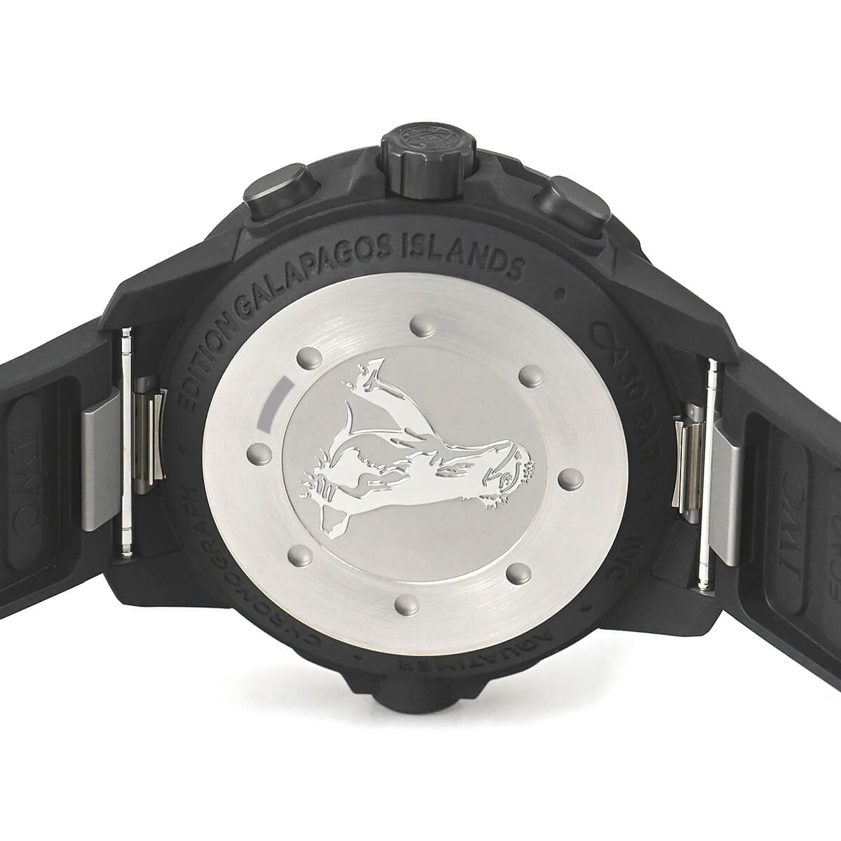 アクアタイマーの中でも一際目立つ「アクアタイマー・クロノグラフ ”ガラパゴス・アイランド”」。加硫加工を施されたブラックラバーでコーティングしたケースは、ガラパゴス諸島の大地を覆う溶岩を、そして針やインデックスなどは島を包み込む雲をイメージ。