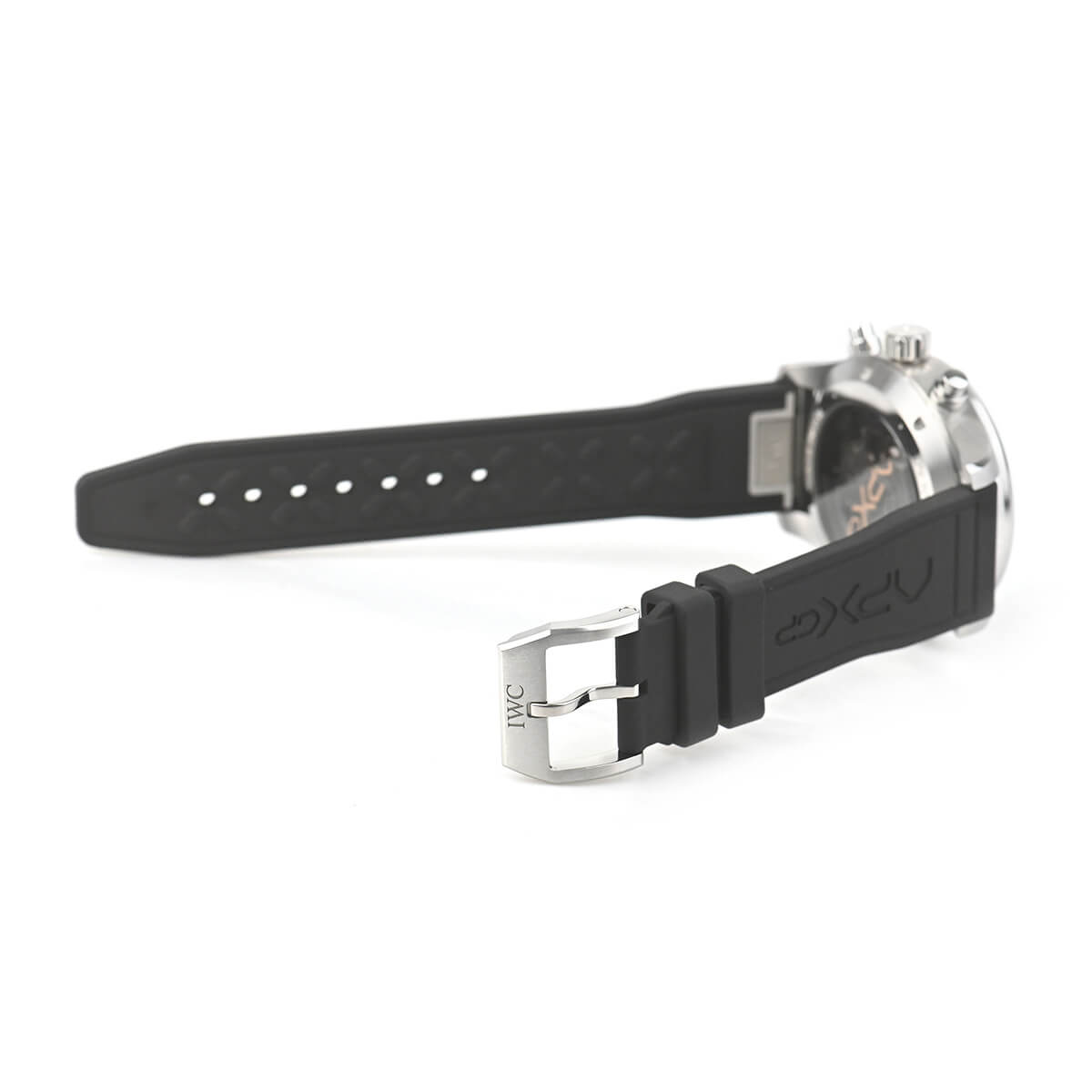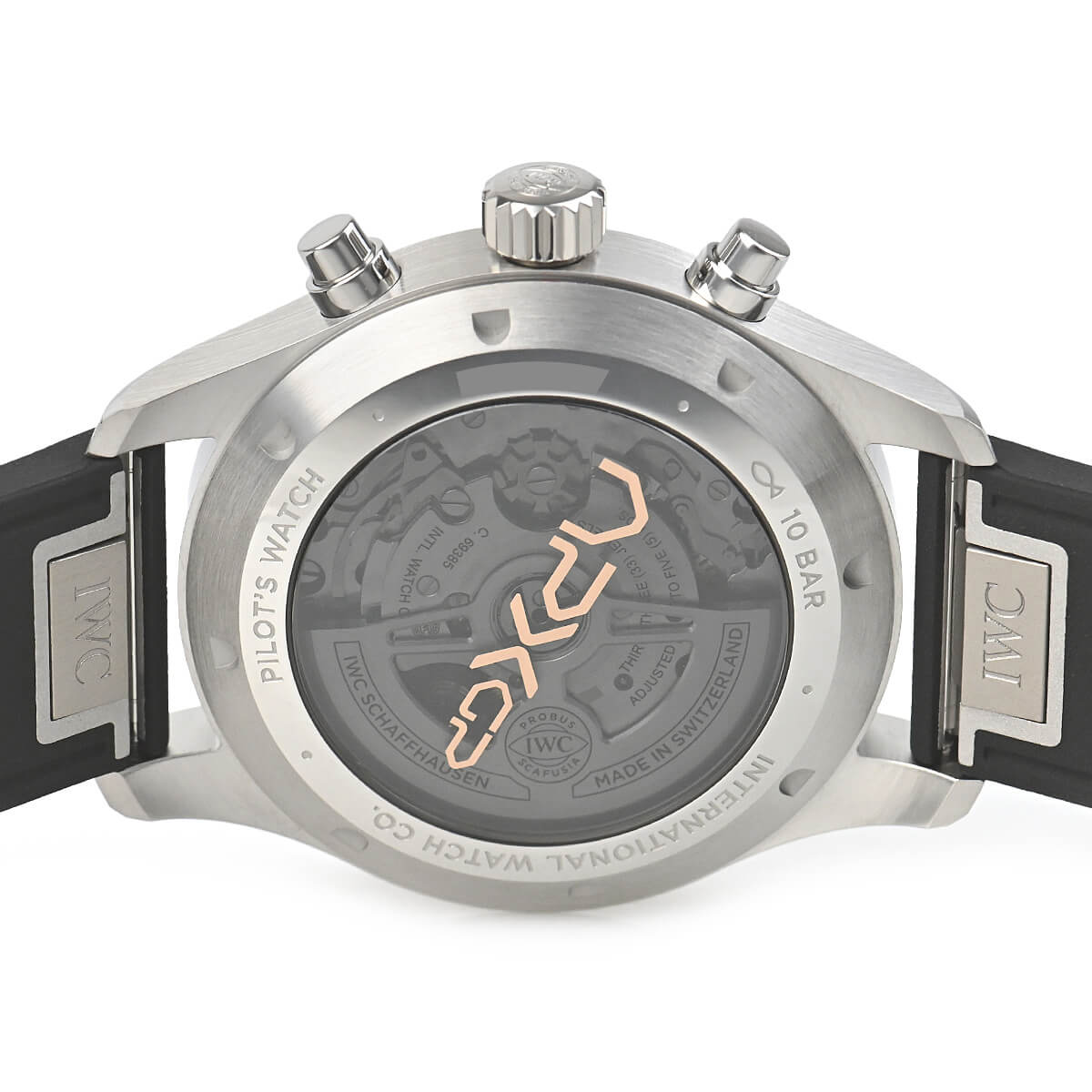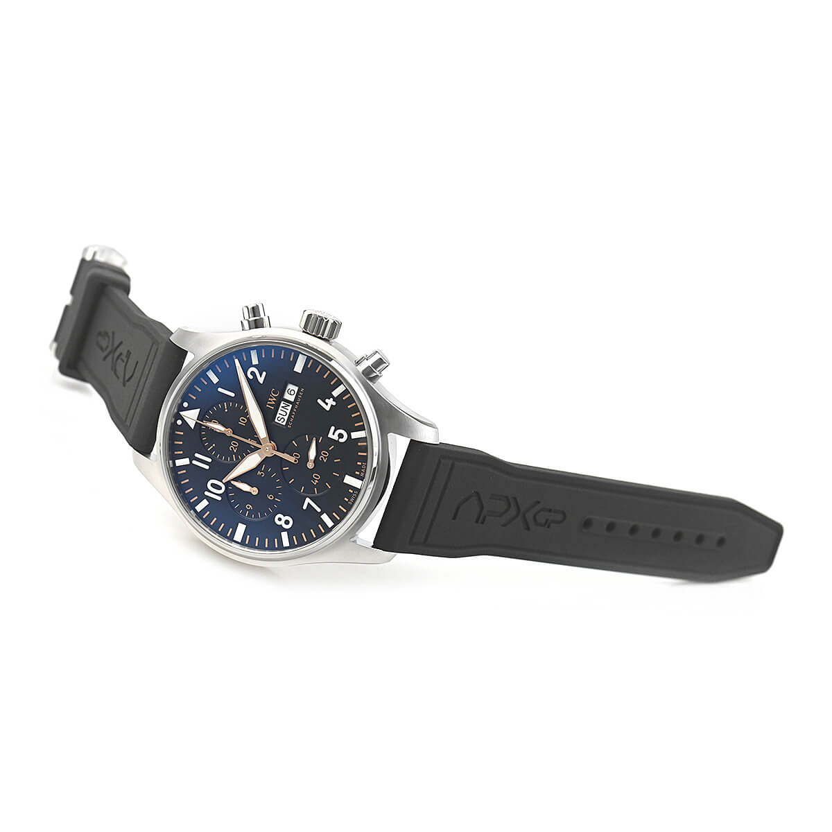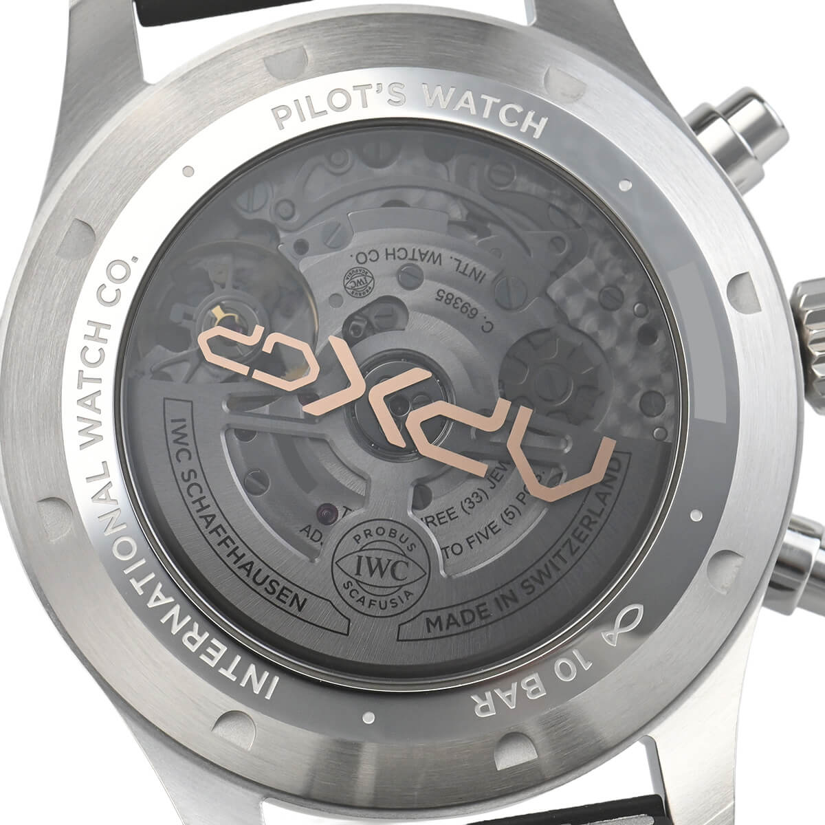 映画『F1/エフワン』に登場する架空の「APXGP」チームに捧げられた特別モデル【パイロット・ウォッチ・クロノグラフ APXGP】は、チームのカラーであるブラック、ゴールド、ホワイトの要素を取り入れたデザインが特徴です。直径43mmのケースには、46時間パワーリザーブの自社開発キャリバー69385を搭載。キャリバー69385は、高級クロノの代名詞ともいえる伝統的なコラムホイール式クロノグラフで、ゼンマイを効率的に巻き上げるラチェット式両方向巻き上げシステムを搭載した8振動ムーブメントです。