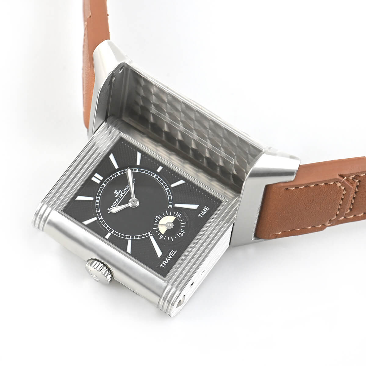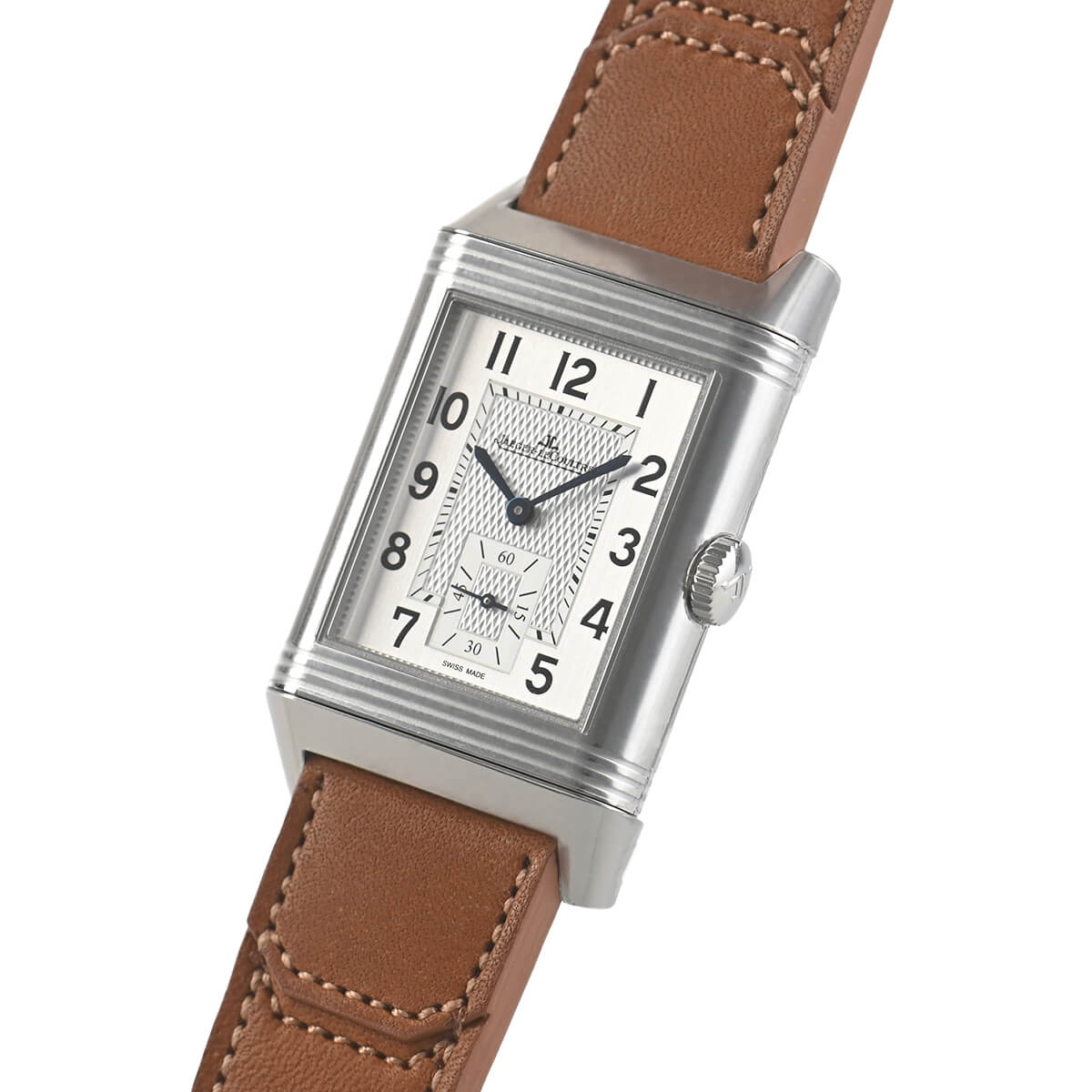 角型時計の代名詞であるレベルソのメンズモデル。反転するケースを巧に活かして、表と裏側で全く表情の異なるデザインにしてあります。