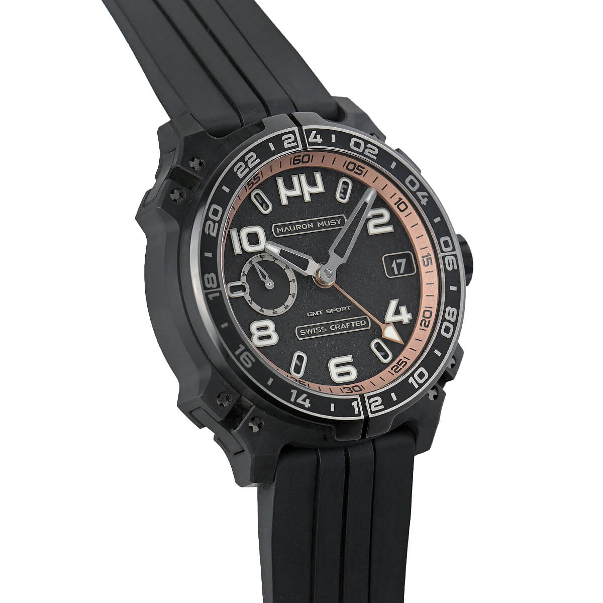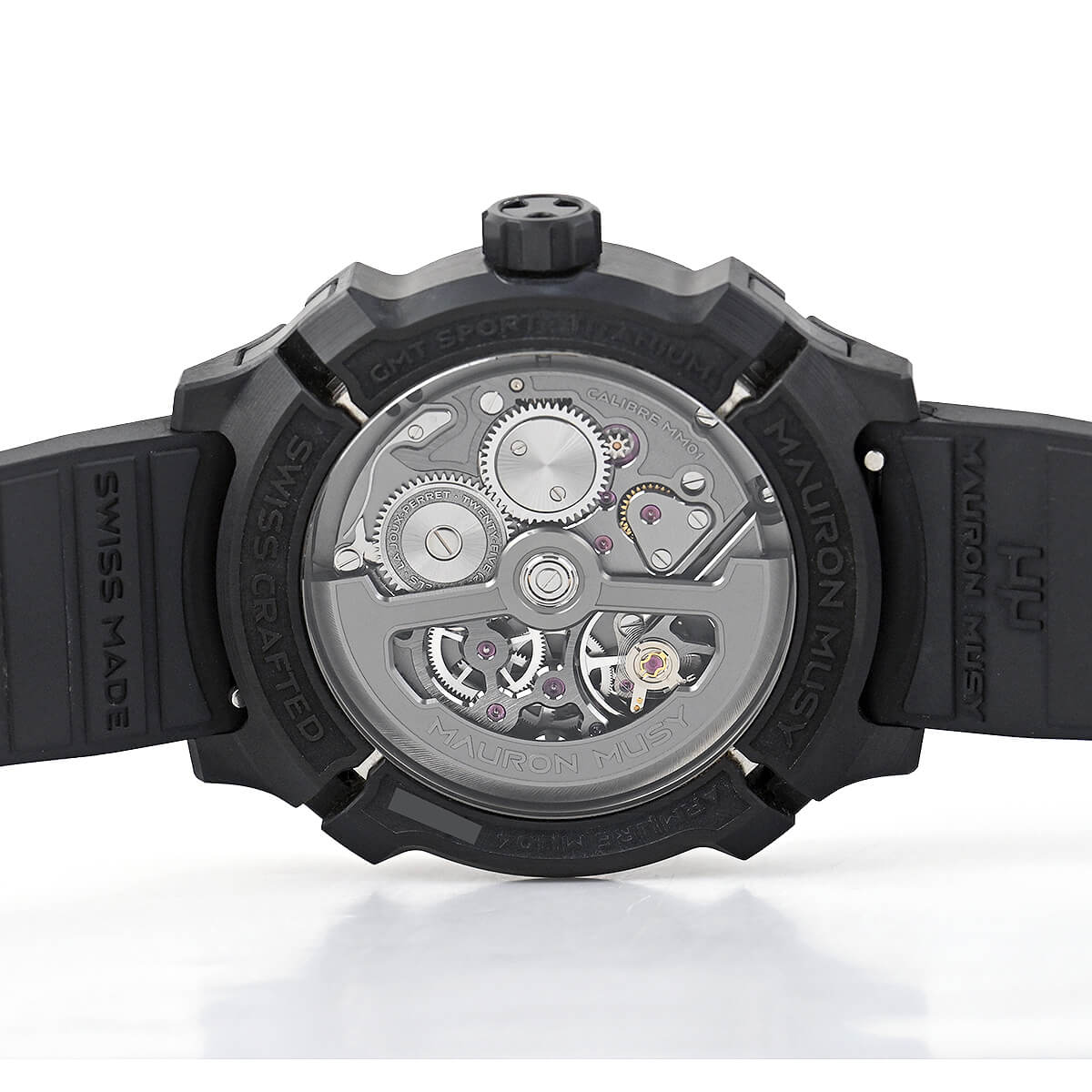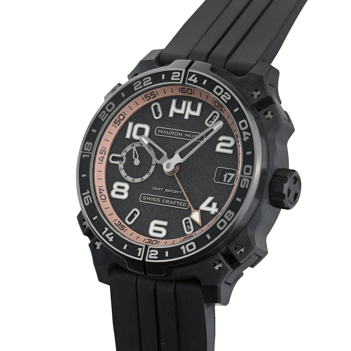 44mm径のケースは、軽量なチタン(ブラックDLC)を採用し、美しい仕上げの自動巻きキャリバーMM01-GMTを搭載。