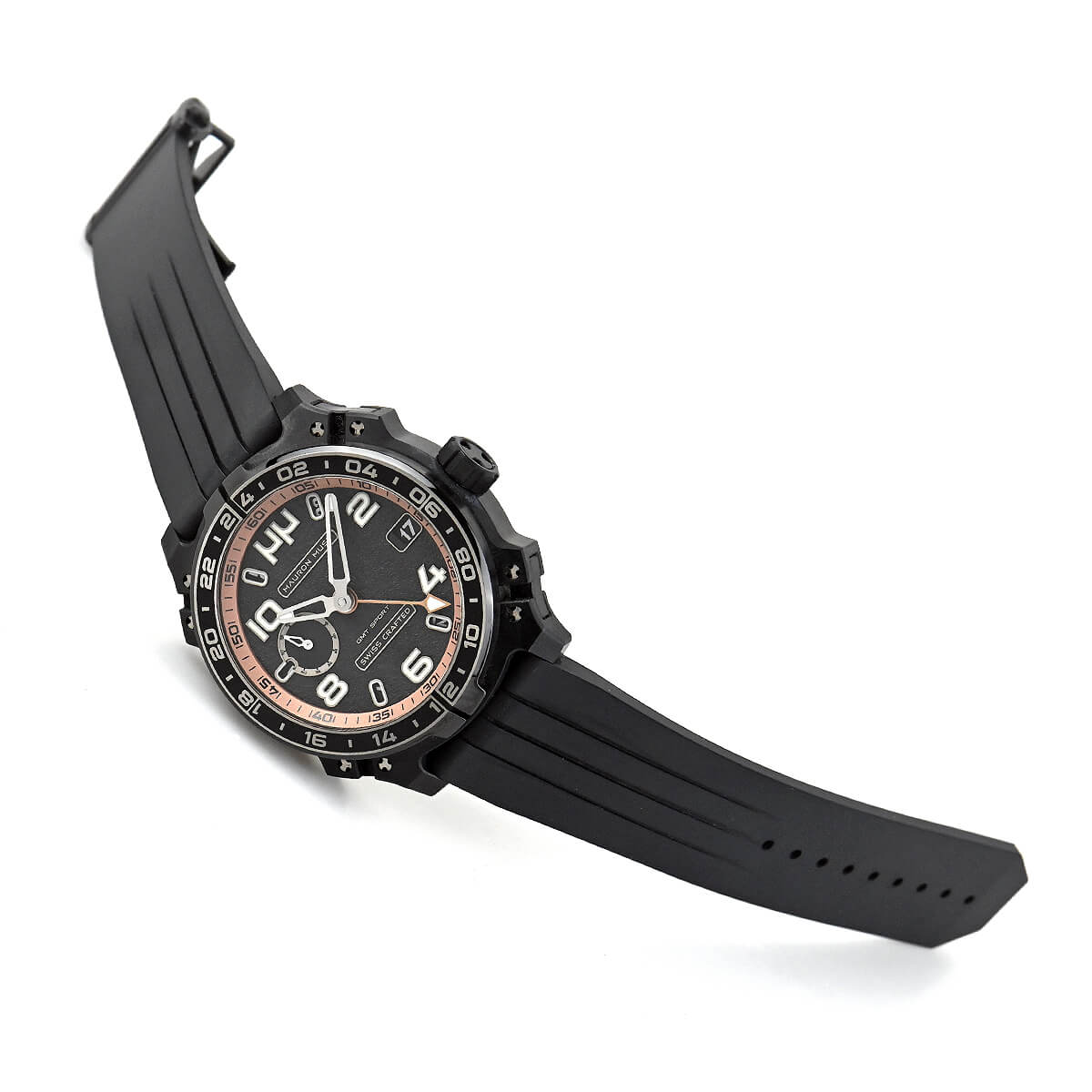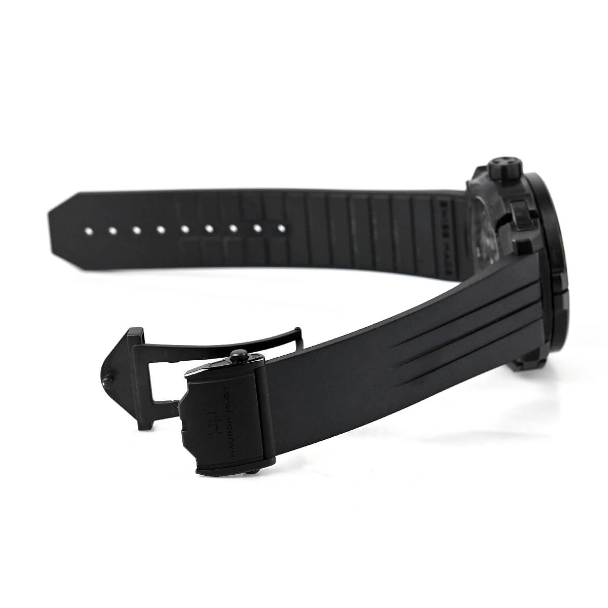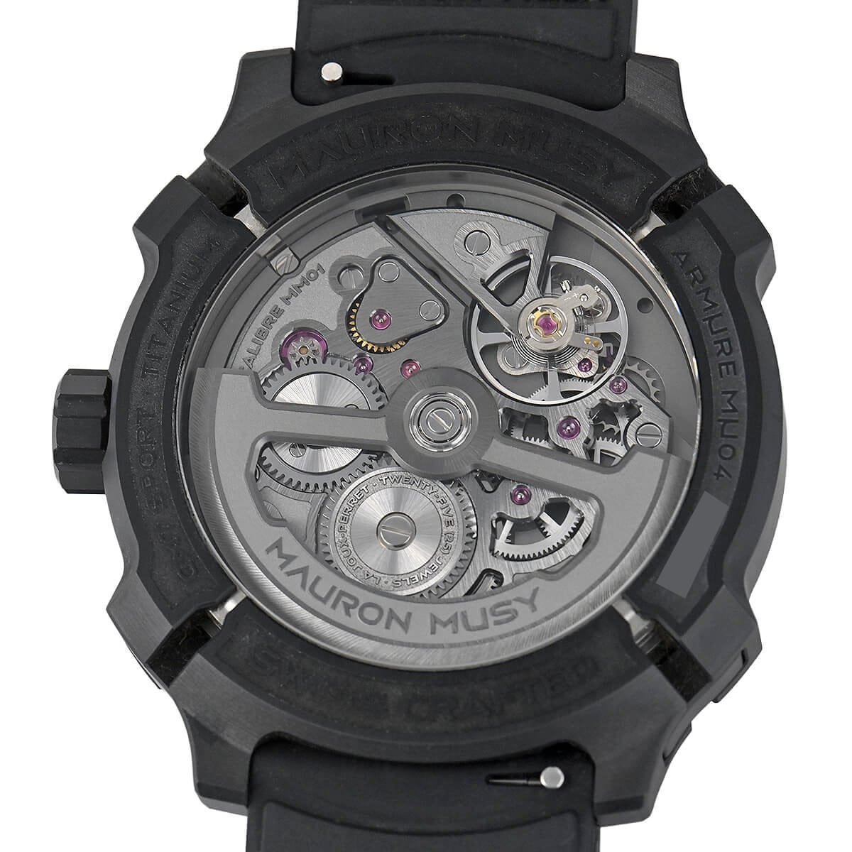 44mm径のケースは、軽量なチタン(ブラックDLC)を採用し、美しい仕上げの自動巻きキャリバーMM01-GMTを搭載。