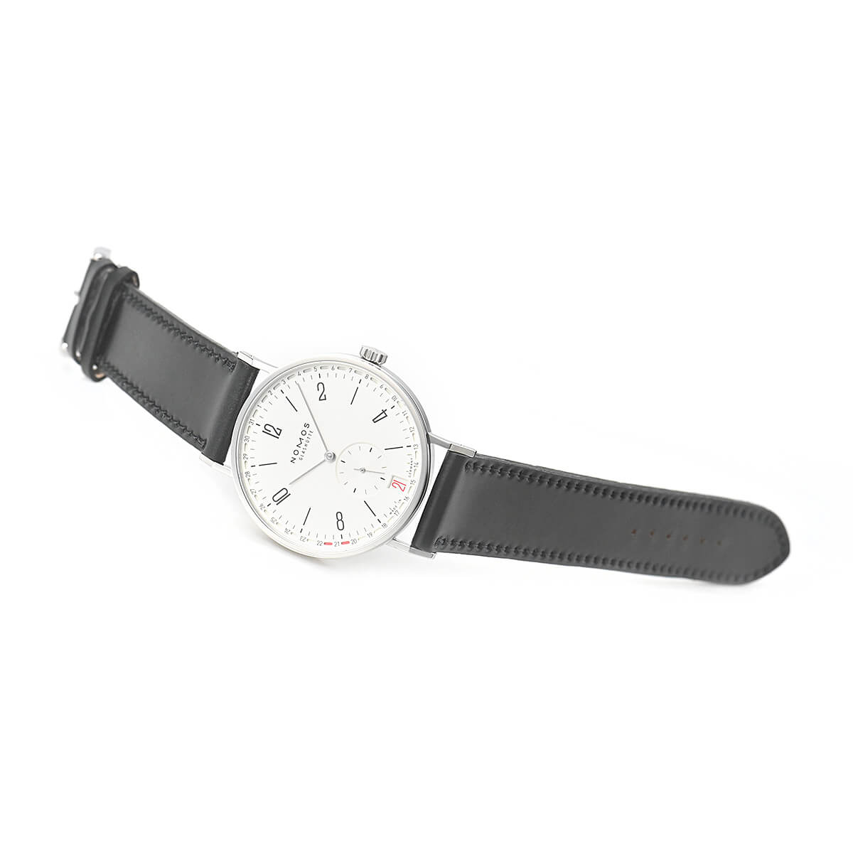 ノモスを代表する「タンジェント」シリーズは、円とフラットな面と直線で構成されたケースデザインが特徴です。こちらはケースサイズが37.5mmのモデル。