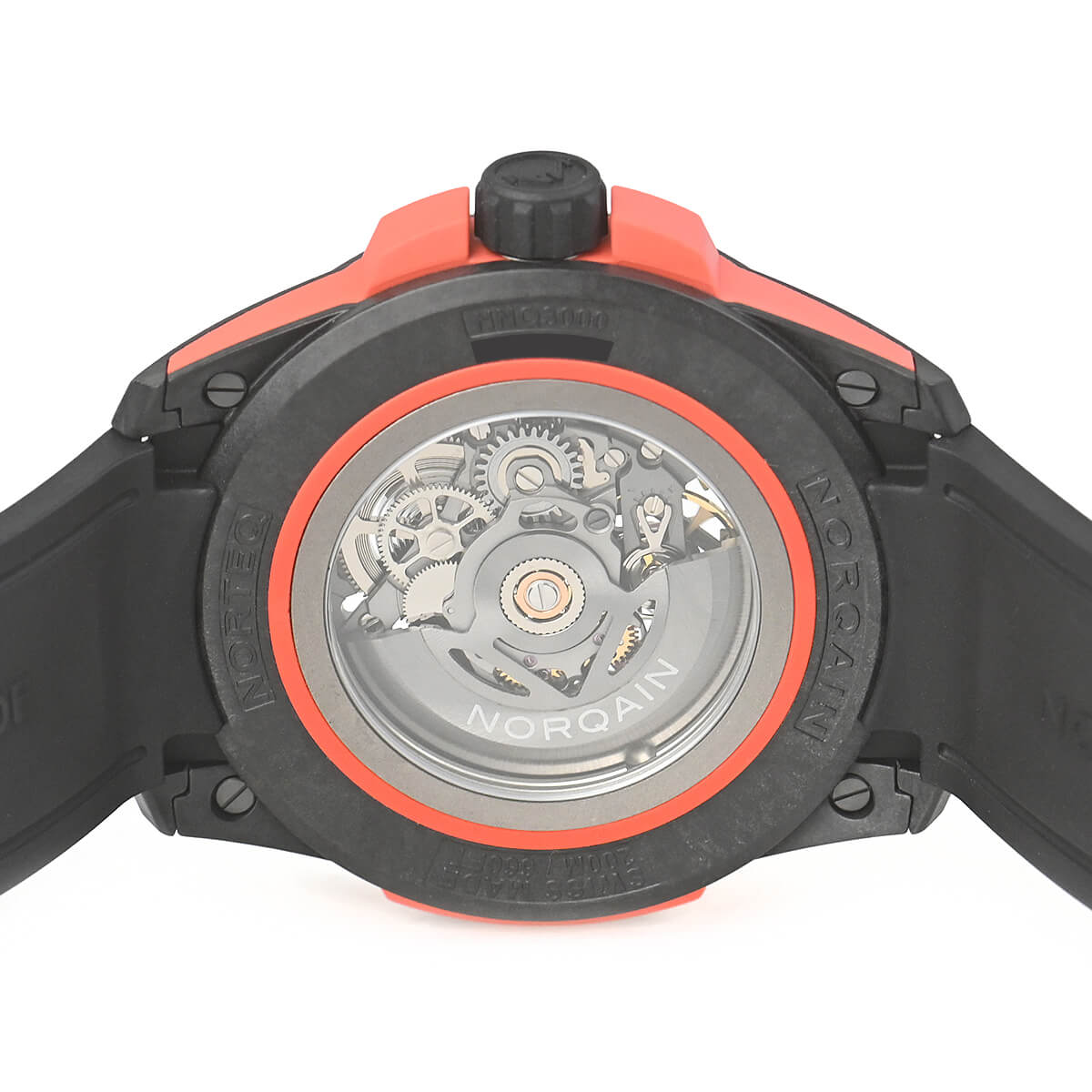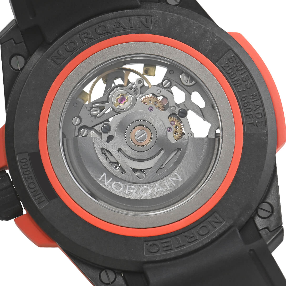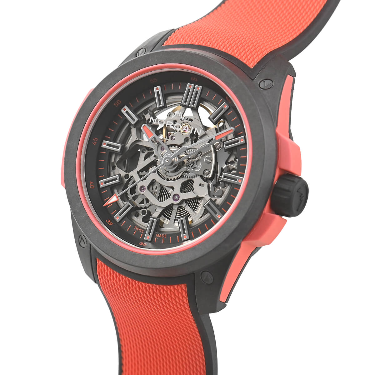 【ワイルドワン スケルトン】は、超堅牢・超軽量を誇る独自のケース素材「NORTEQ-ノルテック-」を使用しています。スケルトンムーブメントの採用により、通常のワイルドワンシリーズよりもさらに軽量化。その重量はわずか78g。これはステンレススチール製のノルケインウォッチの50%以上、通常のワイルドワンシリーズよりも6g軽くなっています。