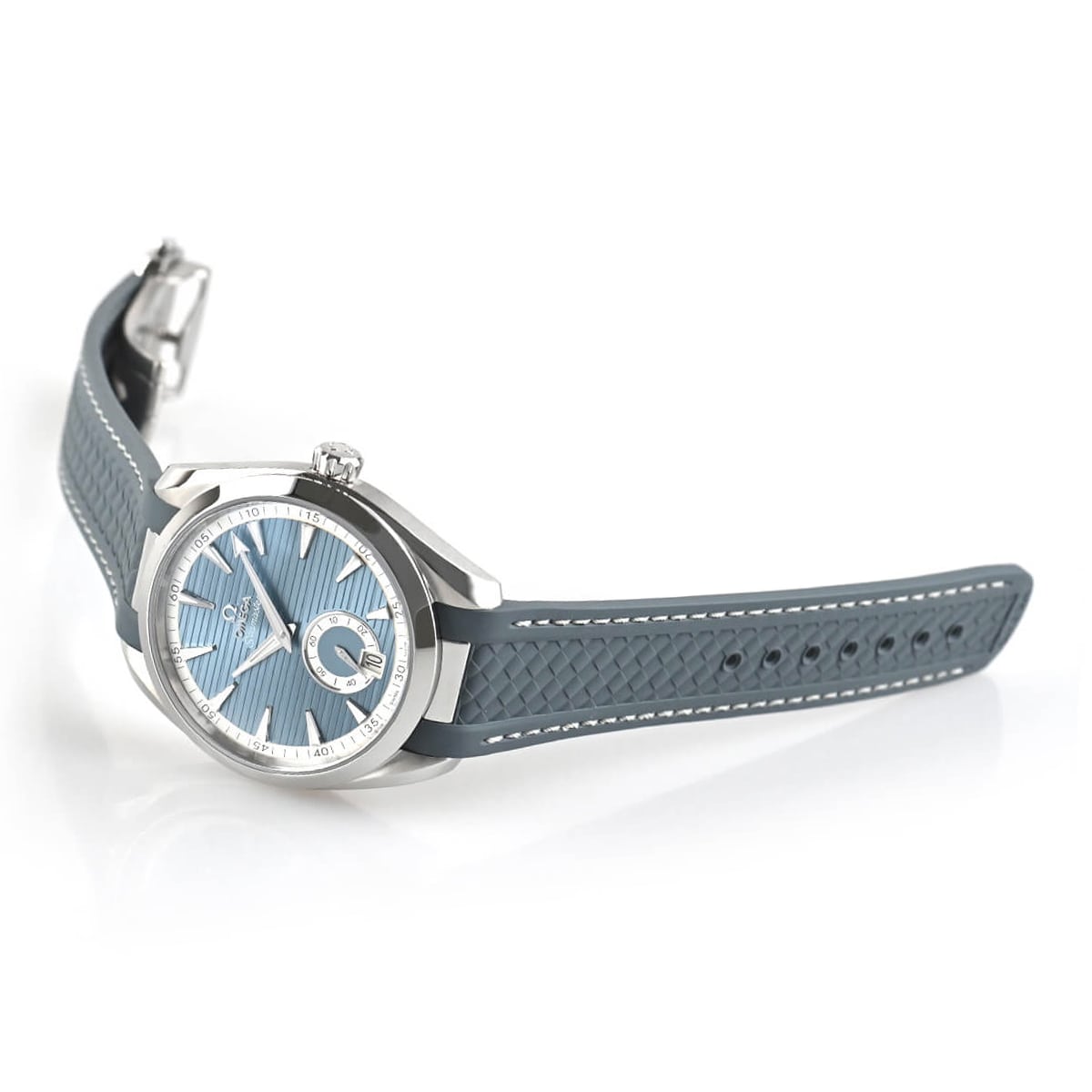 サンブラッシュ仕上げのブルーグレーの文字盤には横縞模様の“チーク”パターンが施され、ムーブメントにはMETAS認定マスタークロノメーターのコーアクシャルキャリバー8916を搭載します。