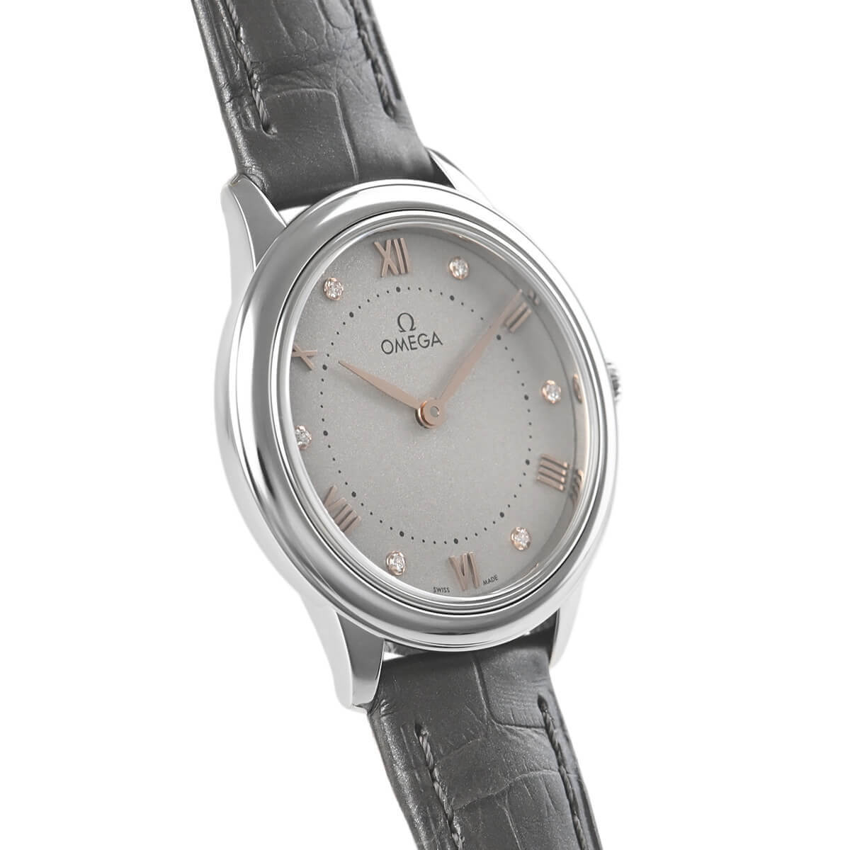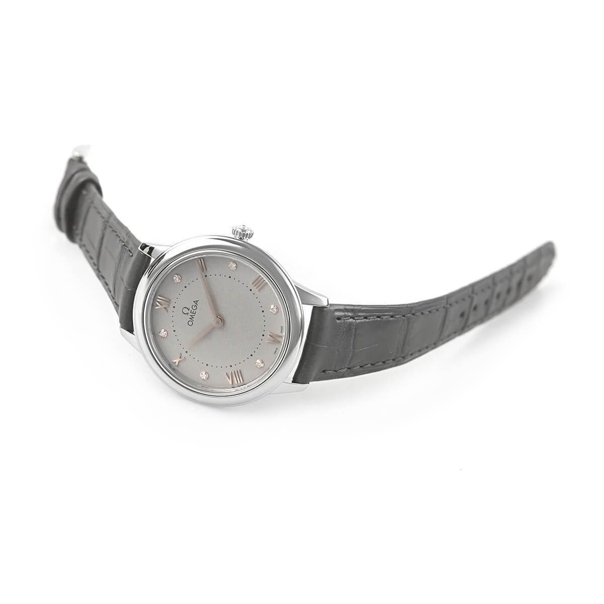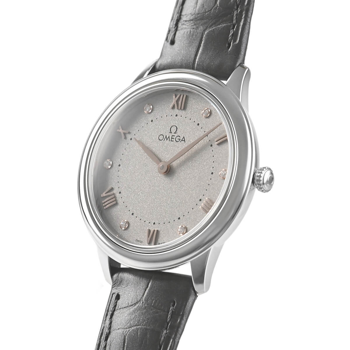 美しいグレー文字盤にはレディースモデルらしく6ポイントのダイヤモンドがセッティングされ、清楚でありながらも華やかな印象です。