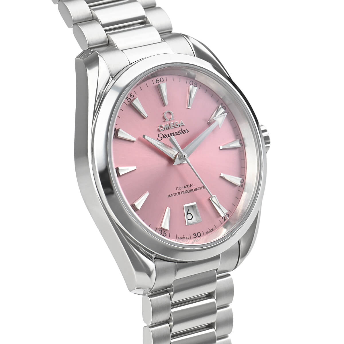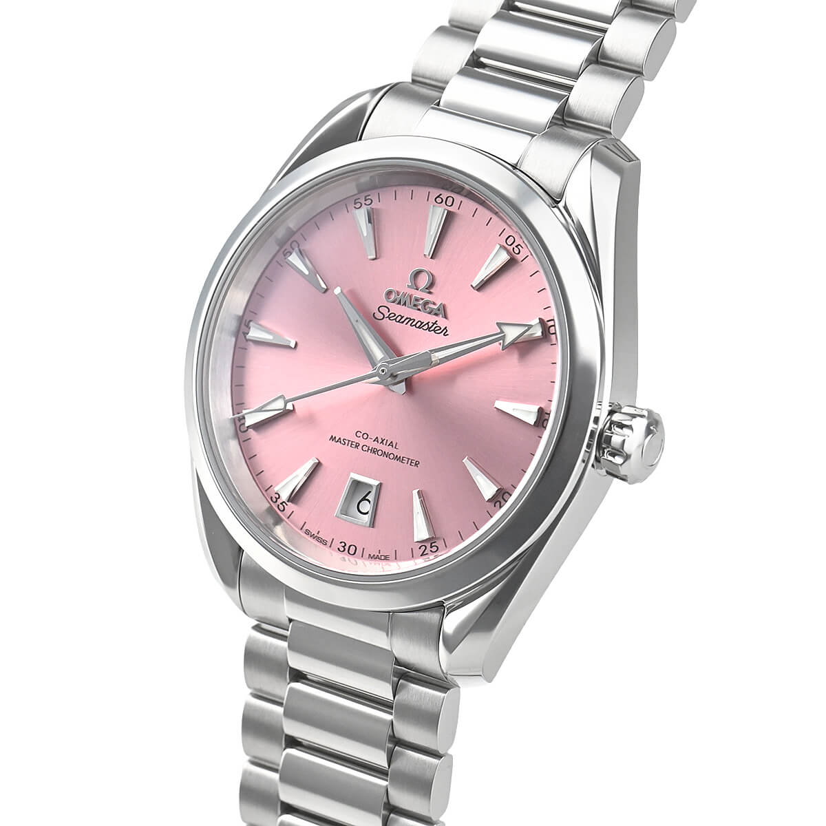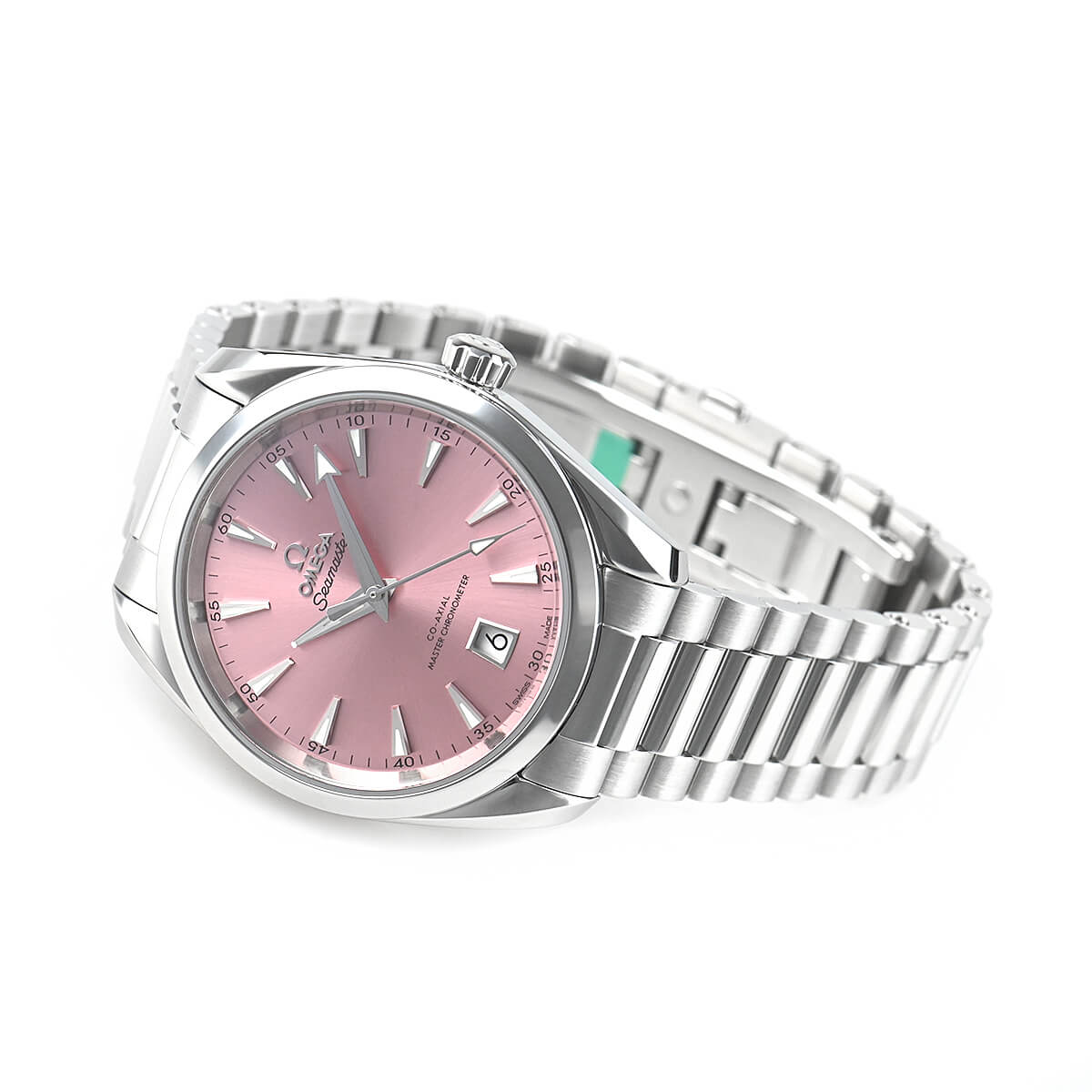 歴史有るペットネーム「シーマスター」を継承する「シーマスター アクアテラ シェード」。文字盤のシェルピンク色が美しく爽やかなケース径38mmのモデル。ムーブメントはMETAS認定マスタークロノメーターのコーアクシャルキャリバー8800を搭載します。