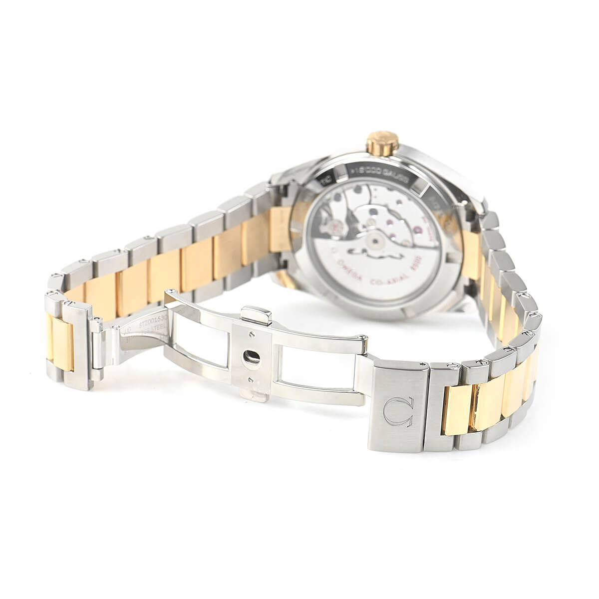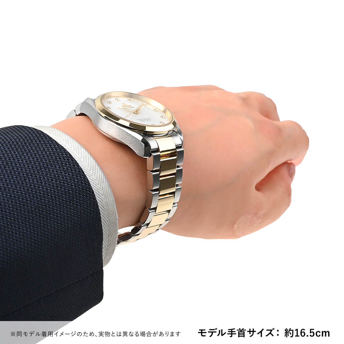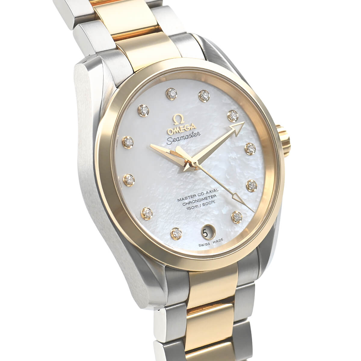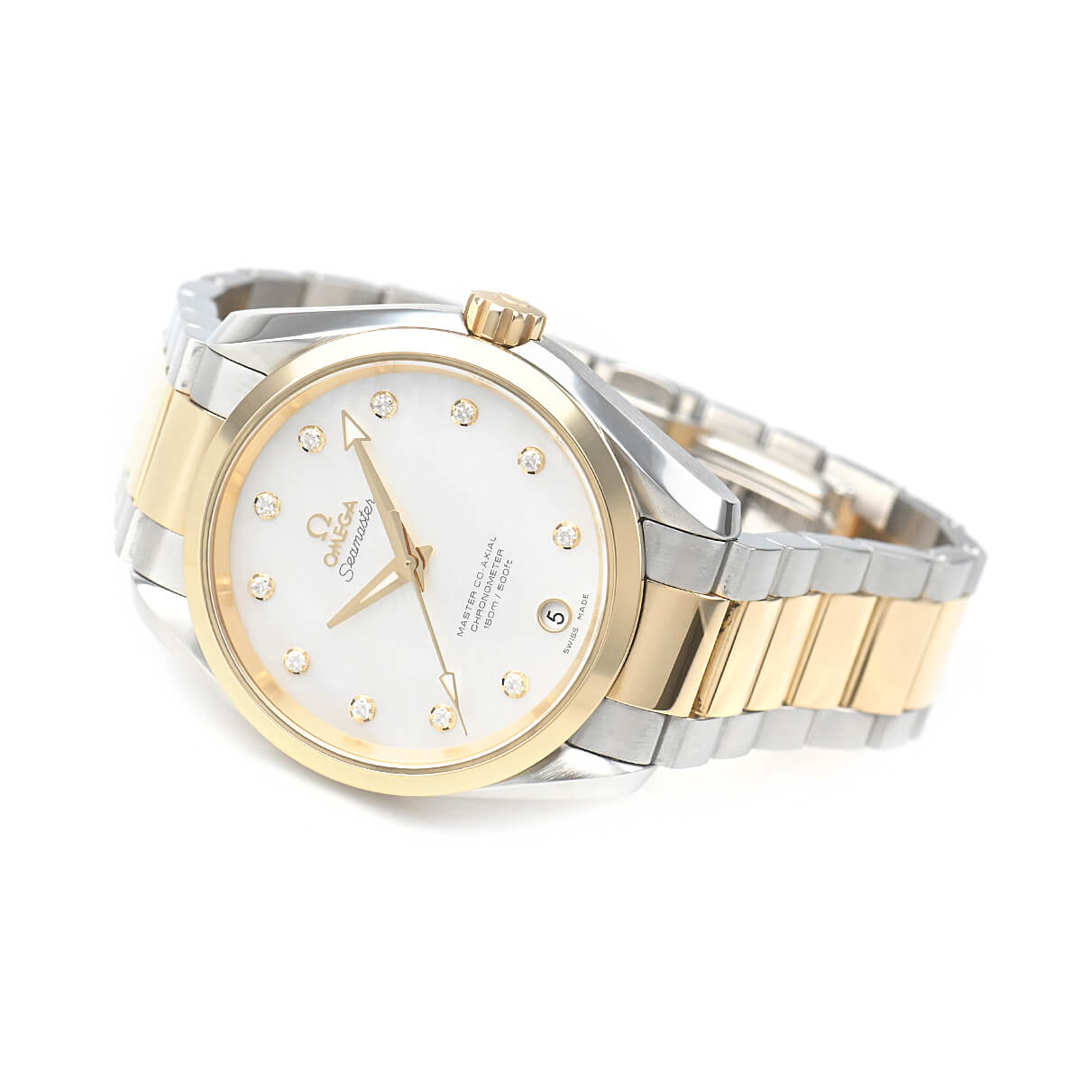 ケース径38.5mmのモデル【シーマスター コーアクシャル アクアテラ 150M】。ホワイト・マザーオブパールダイアルに11ポイントのダイヤセッティングを施したラグジュアリーモデルです。