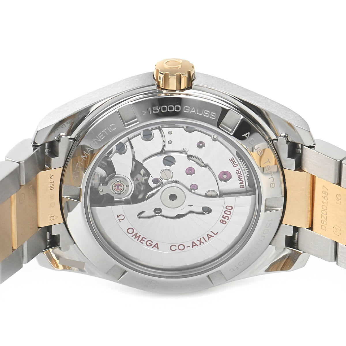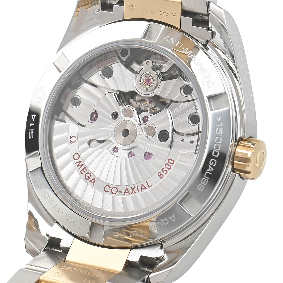 ムーブメントには、新素材のシリシウム製ヒゲゼンマイの採用によって15000ガウスもの耐磁性能を可能にしたコーアクシャルキャリバー8500を搭載します。