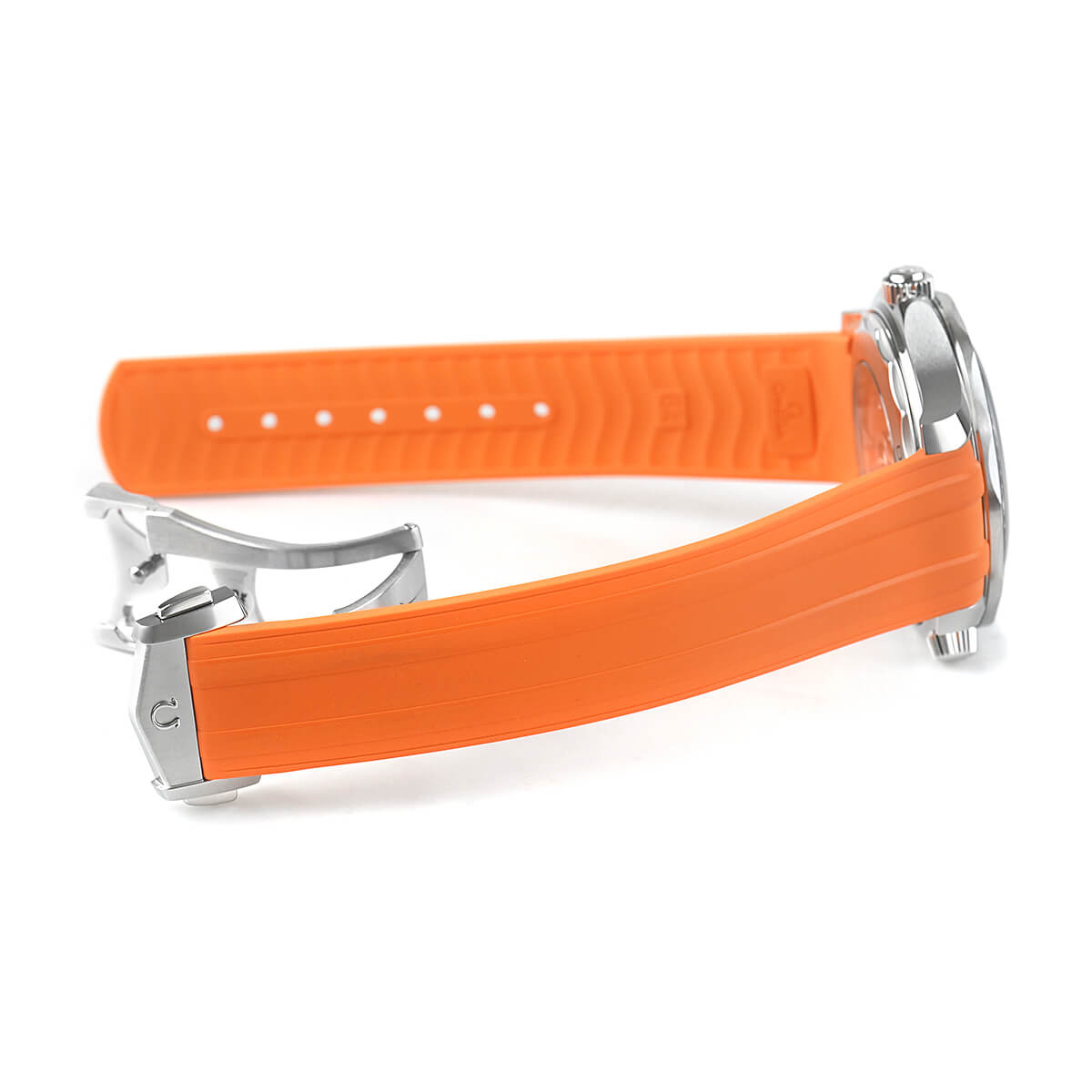 黒色文字盤にオレンジ針が良いコントラストとなり、スタイリッシュに仕上げられた1本です。