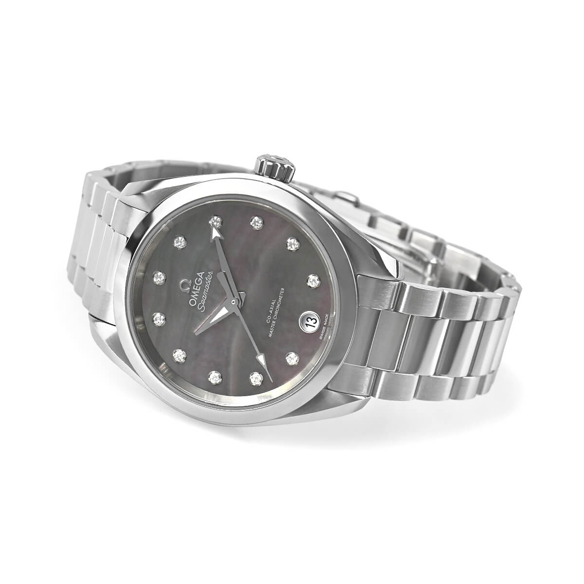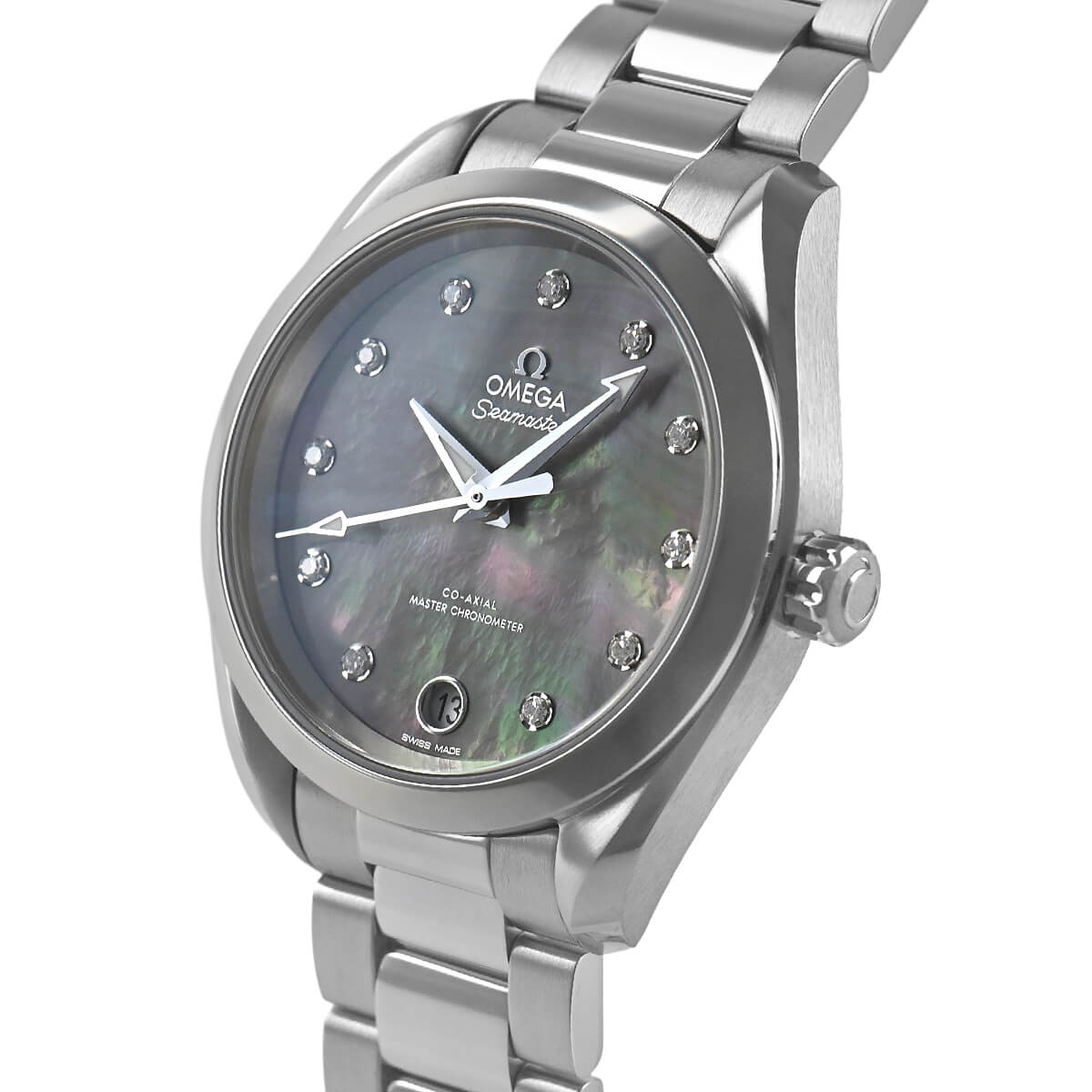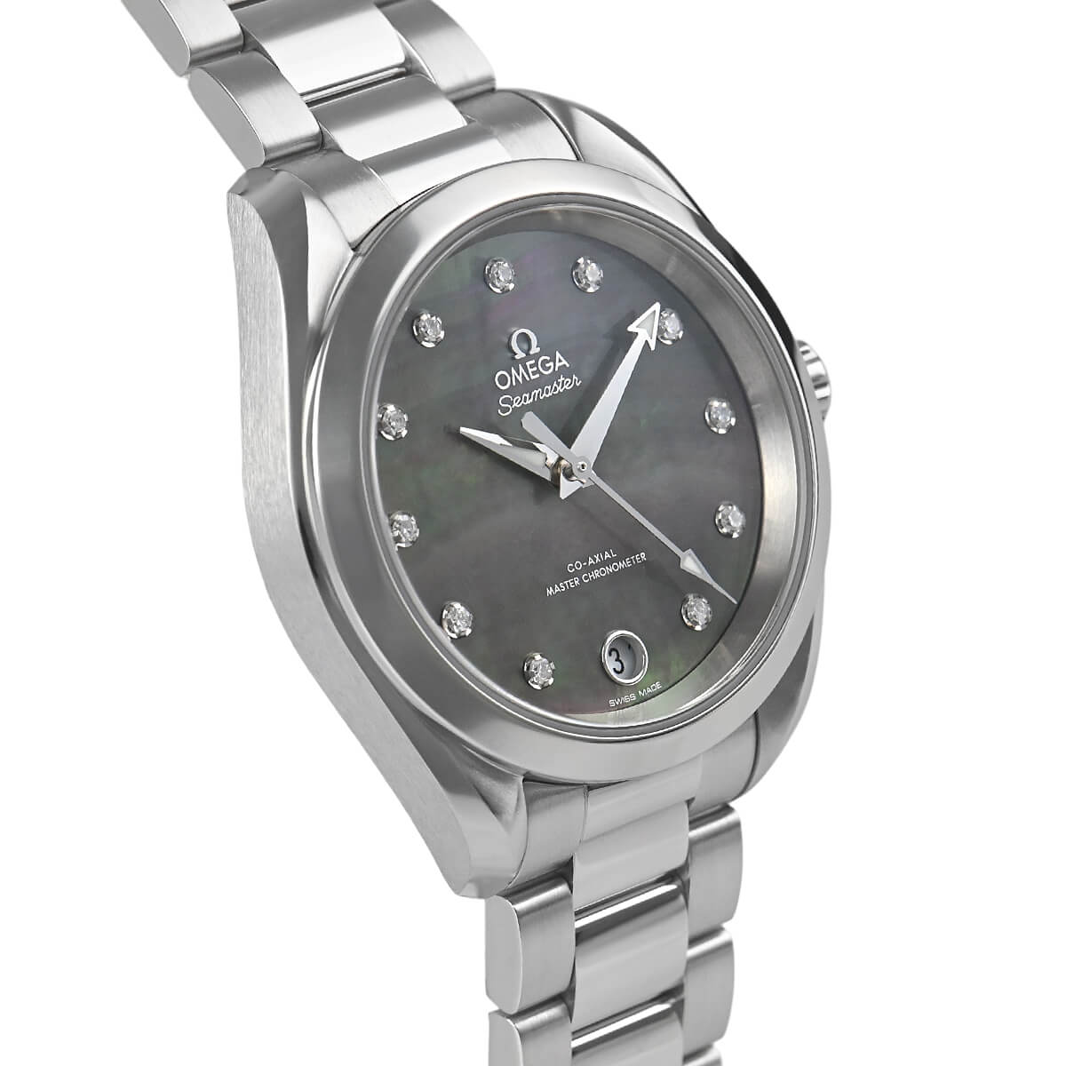 こちらはステンレス製で、美しい色合いのグレーシェル文字盤には11ポイントのダイヤモンドをセッティングした華やかなモデルです。