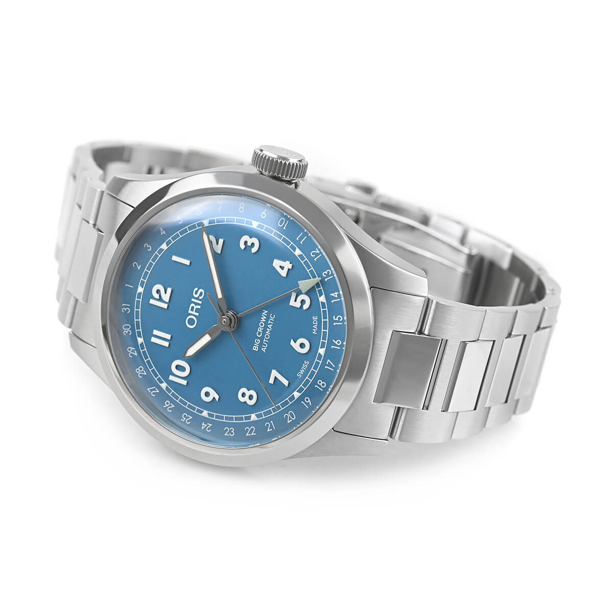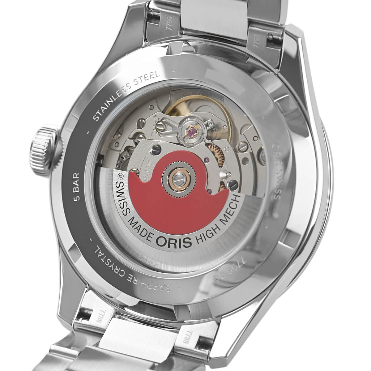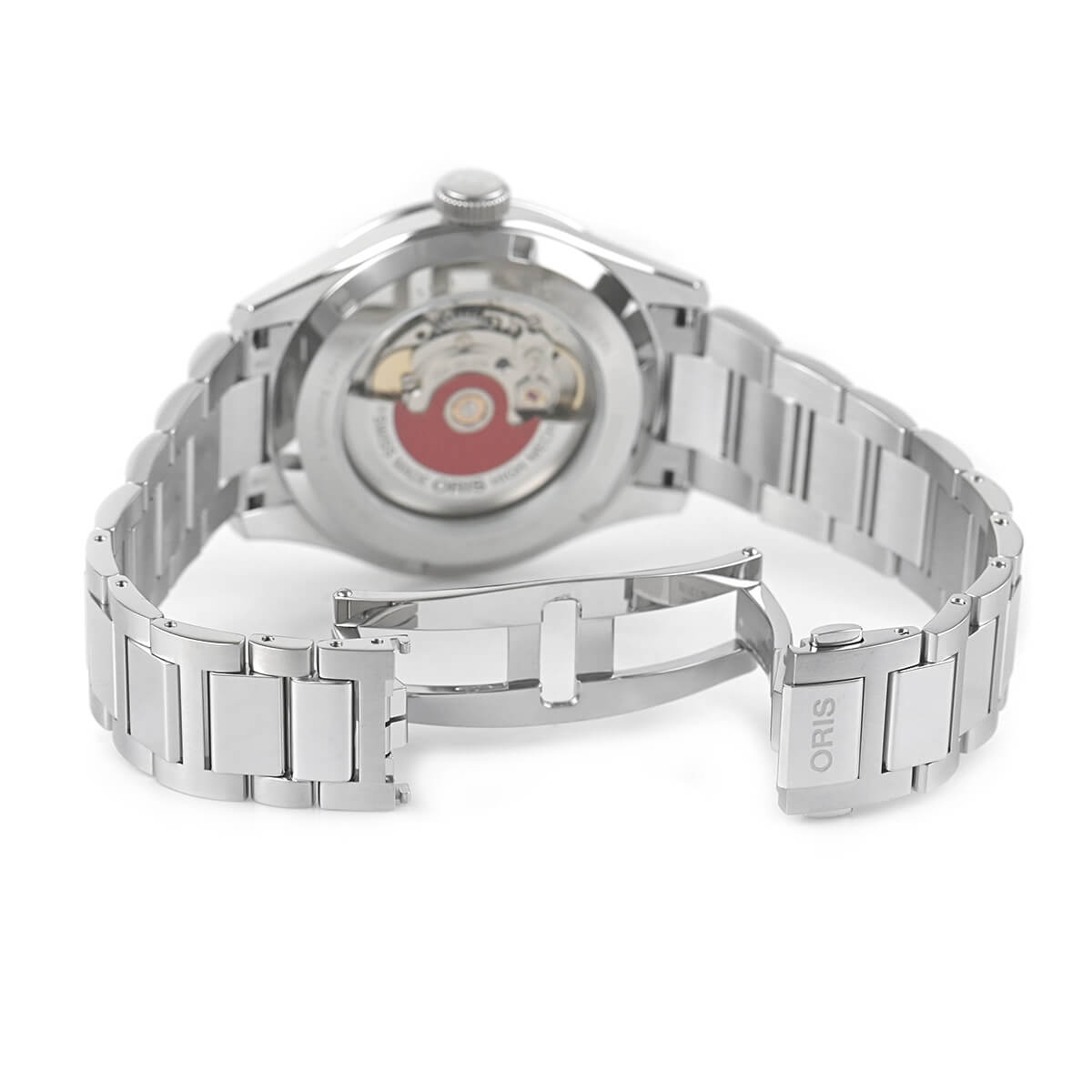オリスの定番モデル「ビッグクラウン ポインターデイト」。シンプルなデザインで視認性に優れ、シースルバックからはムーブメントを眺める事が出来ます。