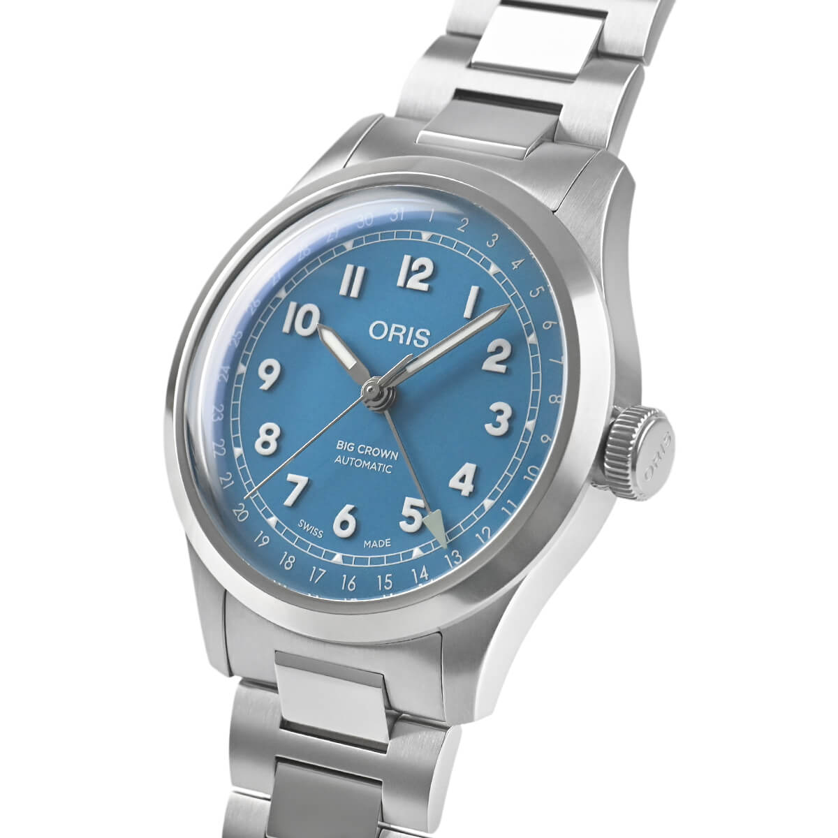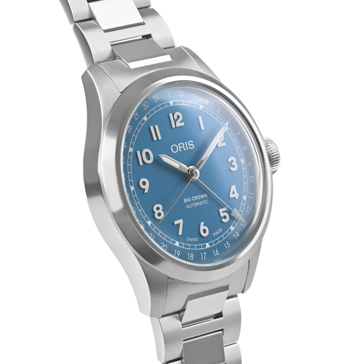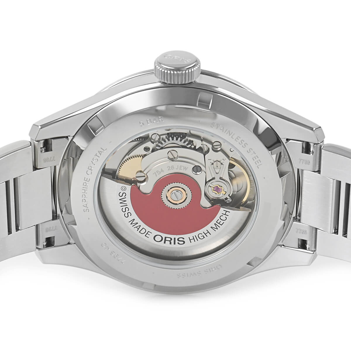 オリスの定番モデル「ビッグクラウン ポインターデイト」。シンプルなデザインで視認性に優れ、シースルバックからはムーブメントを眺める事が出来ます。