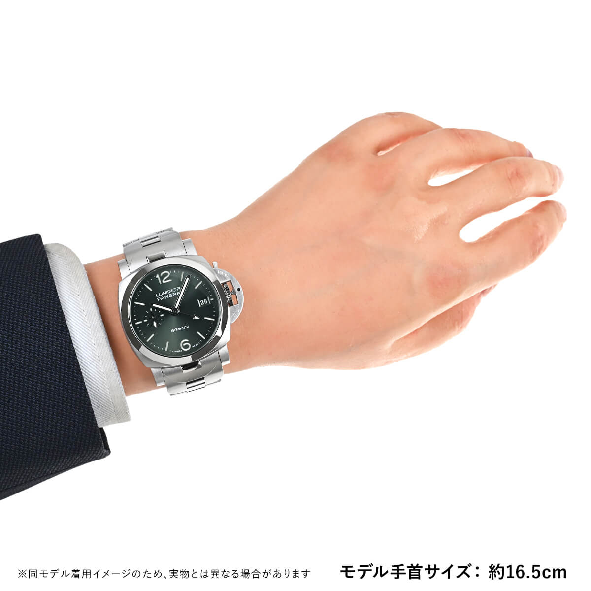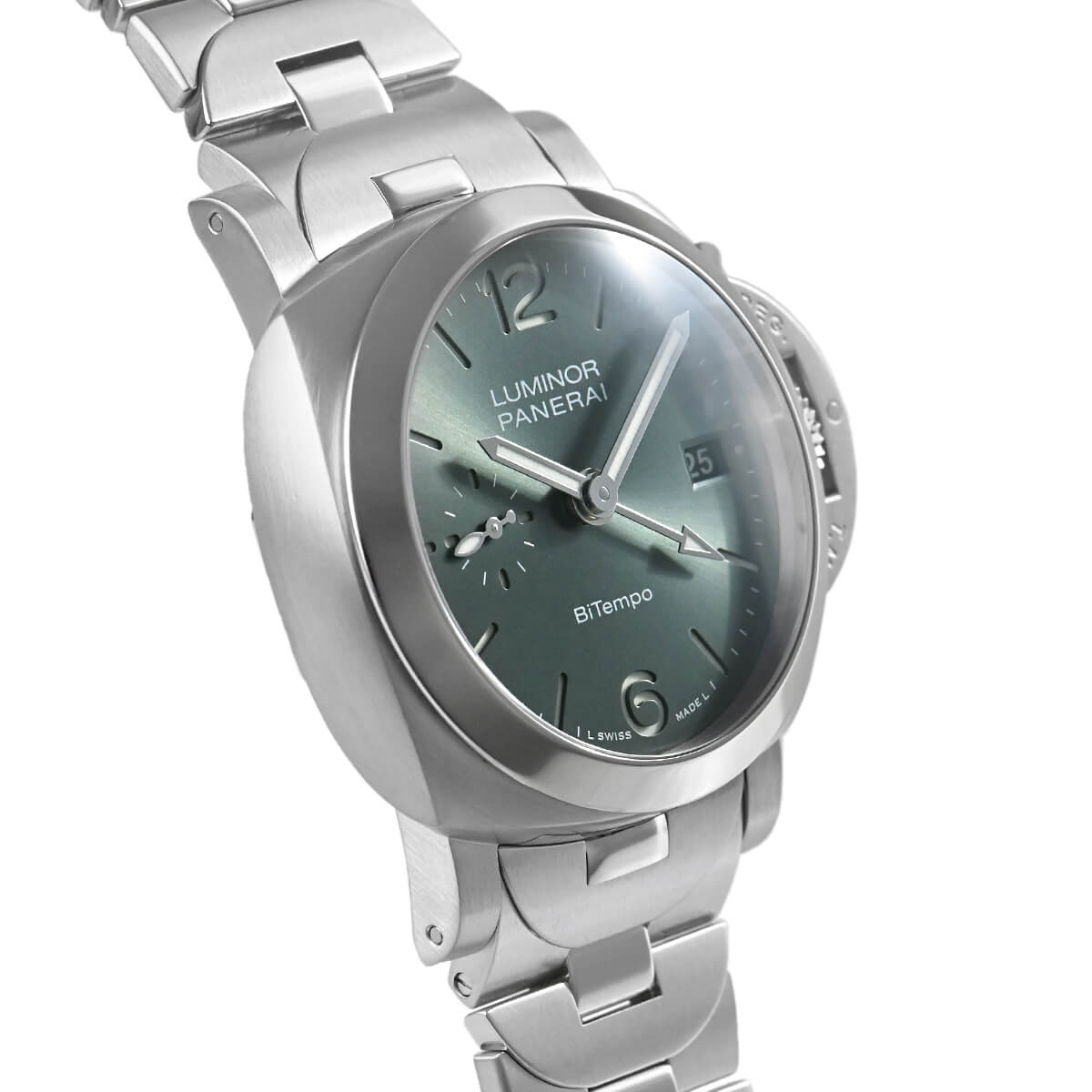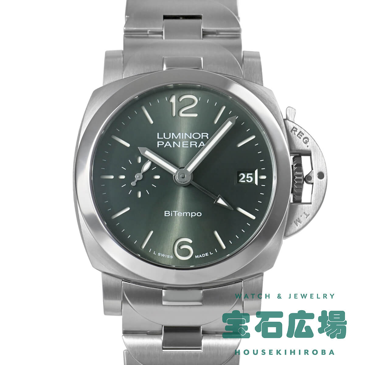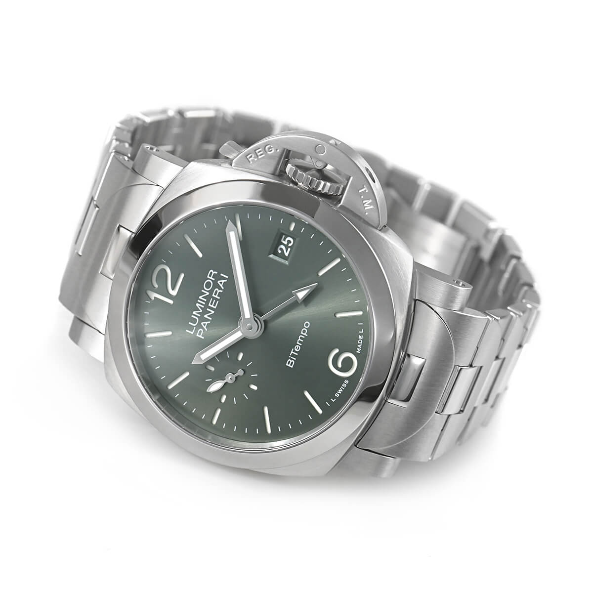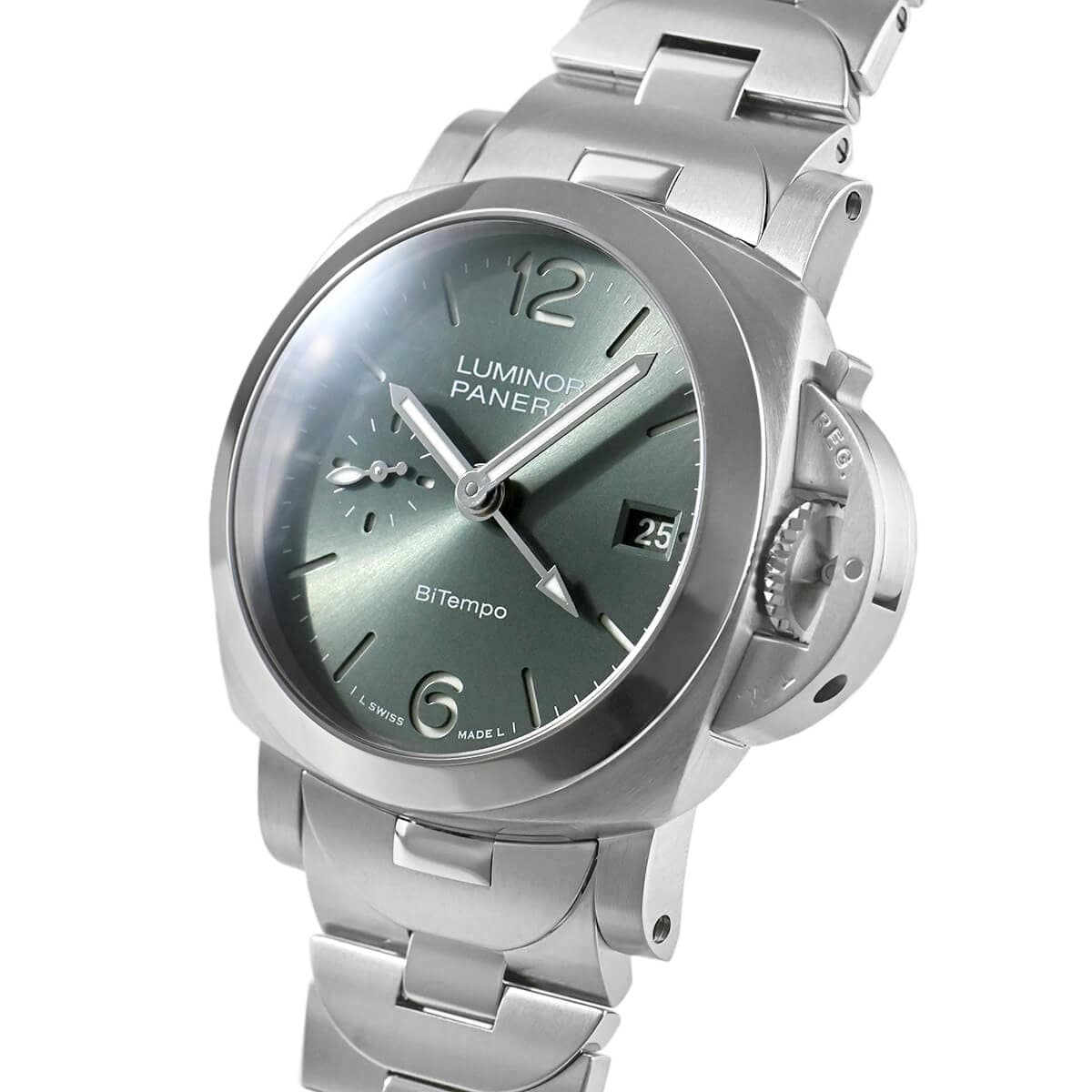 サンドブラスト(梨地)仕上げが施されたグリーンダイアルが爽やかな【PAM01640 ルミノールマリーナ クアランタ BiTempo】クアランタはイタリア語で40を意味します。