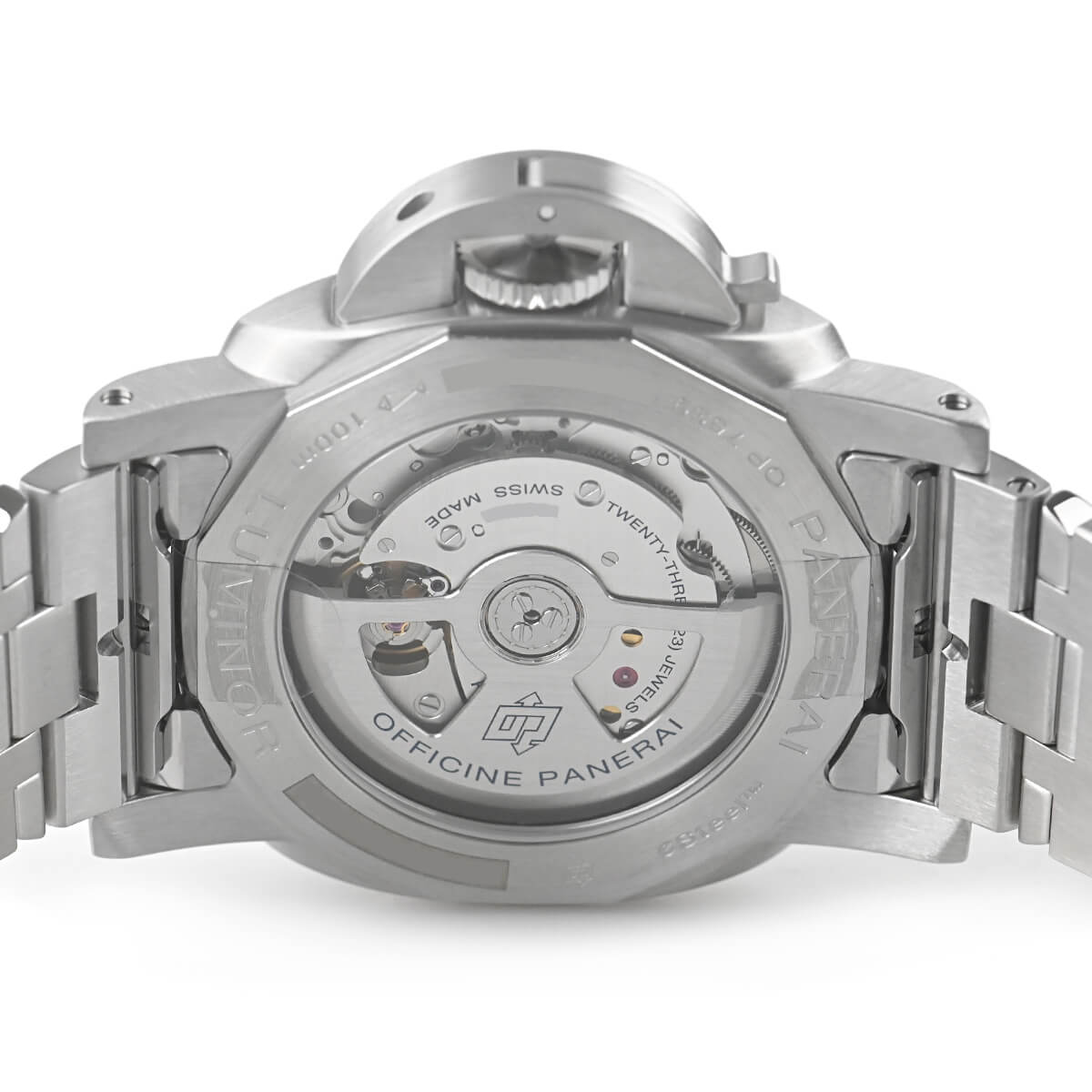 ムーブメントは、ヌーシャテルのパネライ マニュファクチュールで製造された、もっとも薄い自動巻きムーブメントの一つである、3日間パワーリザーブの自社製自動巻きGMT機能も付いたキャリバーP.900/GMTを搭載。