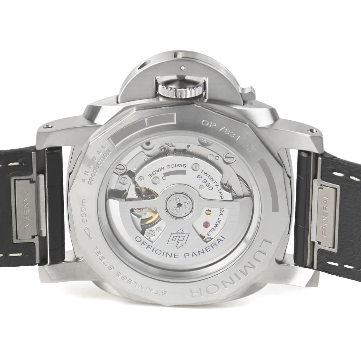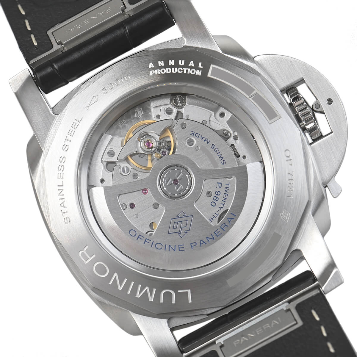 驚くべきは、防水性がシースルーバックケースにも関わらず500m防水にグレードアップされており、パネライの技術の高さが伺えます。