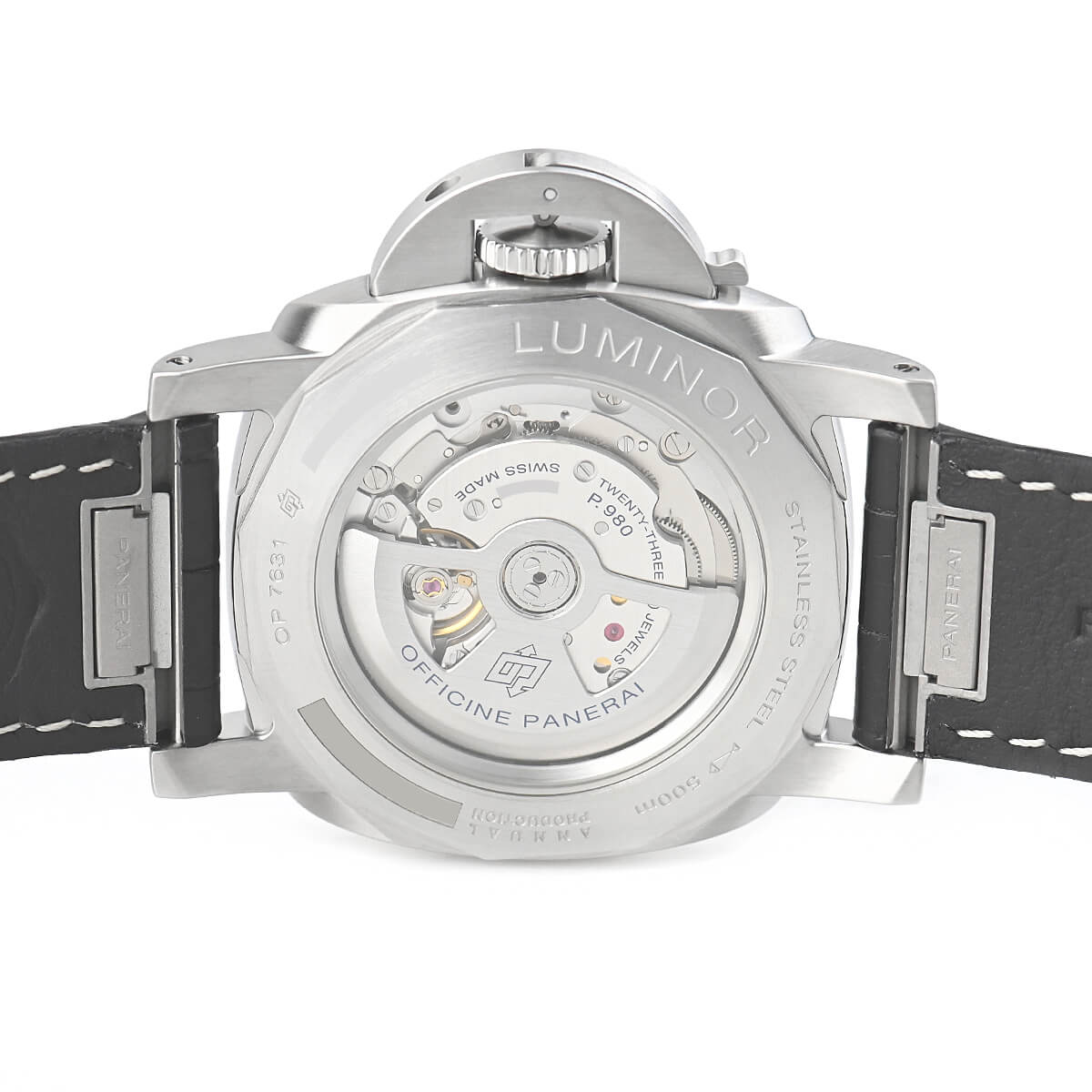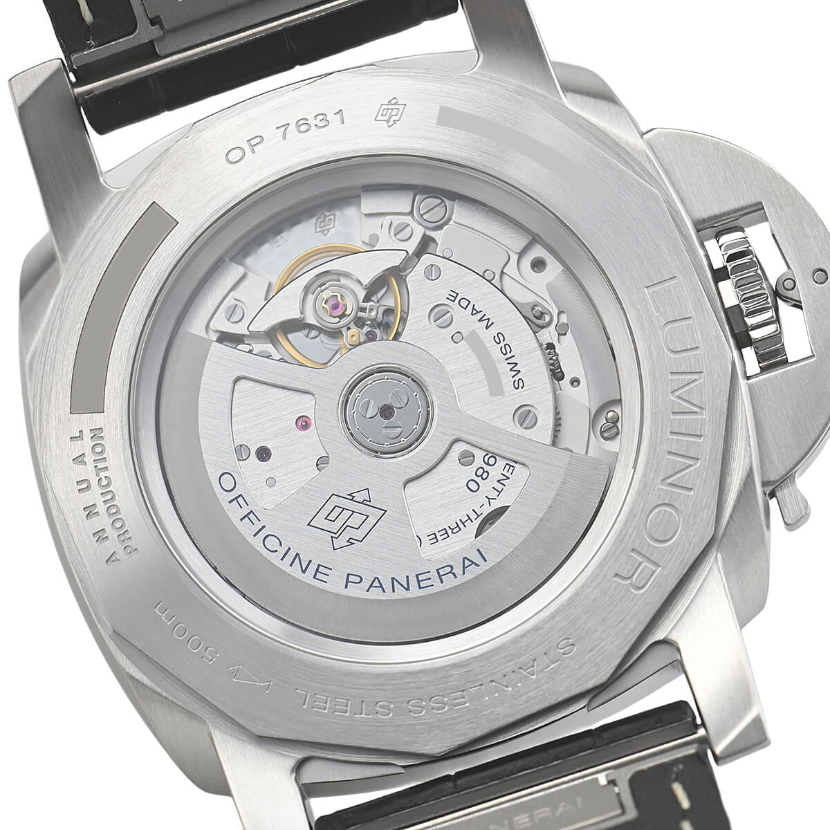 ムーブメントには3日間パワーリザーブの自社製自動巻きキャリバーP.980を搭載。新ルミノールマリーナはシースルーバックのケースですが500メートル防水を誇ります。