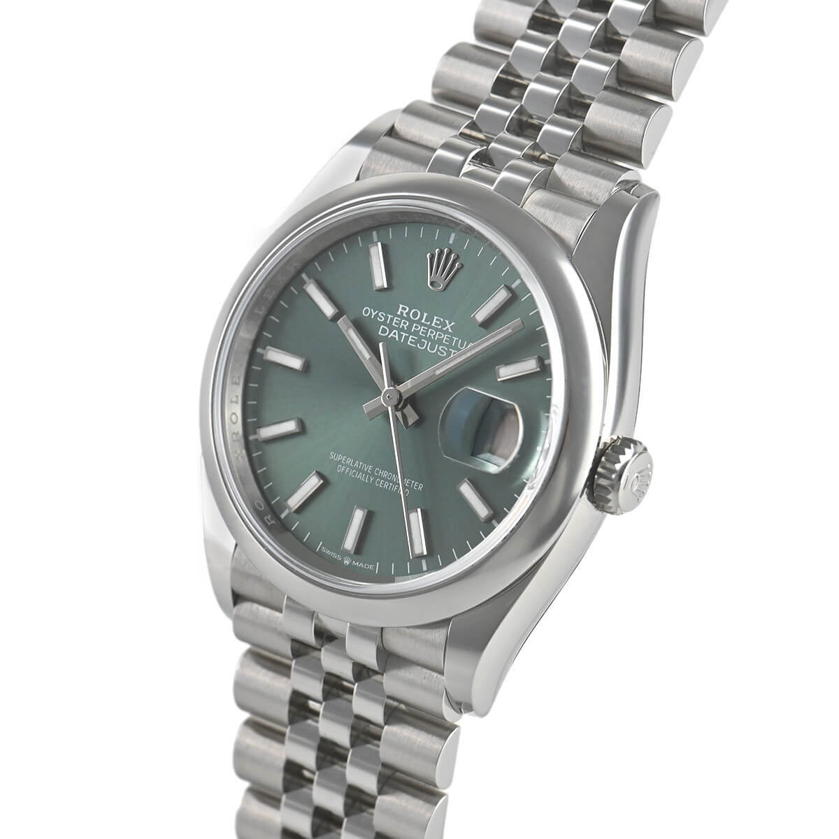 ケース径36mmのメンズモデル、【オイスターパーペチュアル デイトジャスト36】。こちらはステンレスモデルとなり、文字盤はミントグリーン/バーインデックスです。