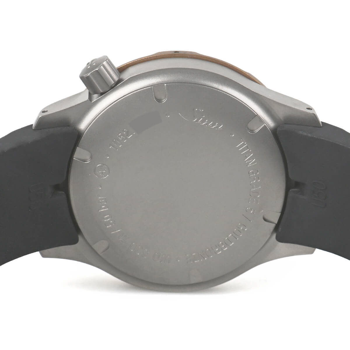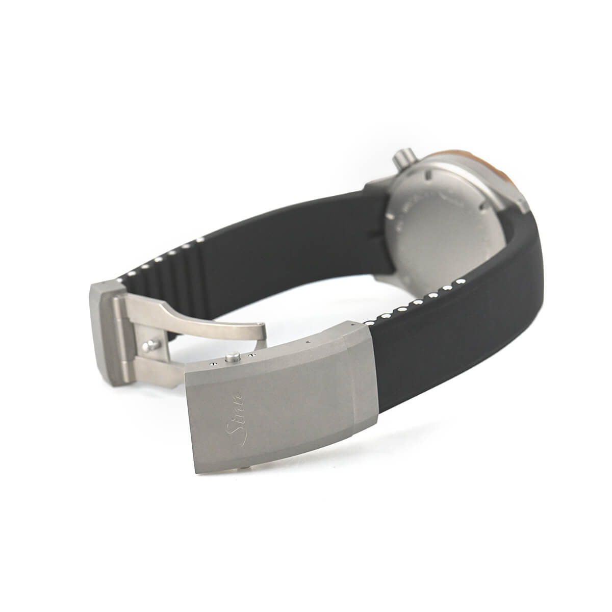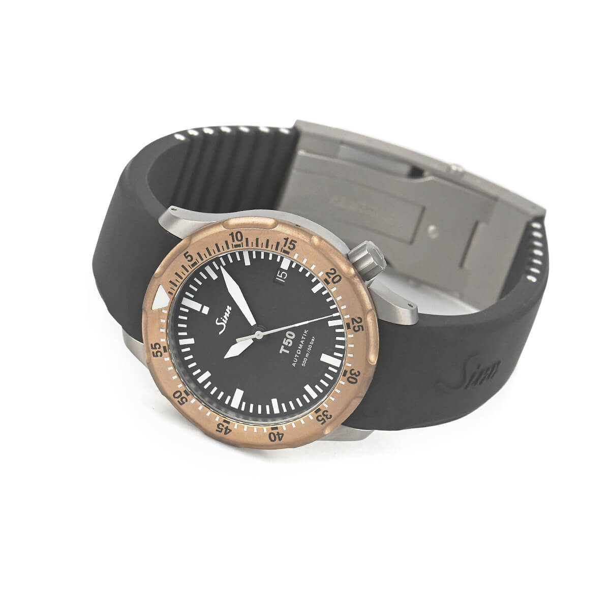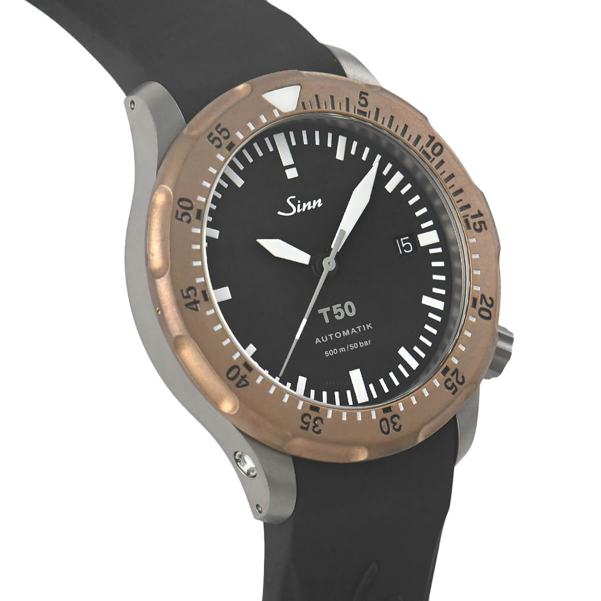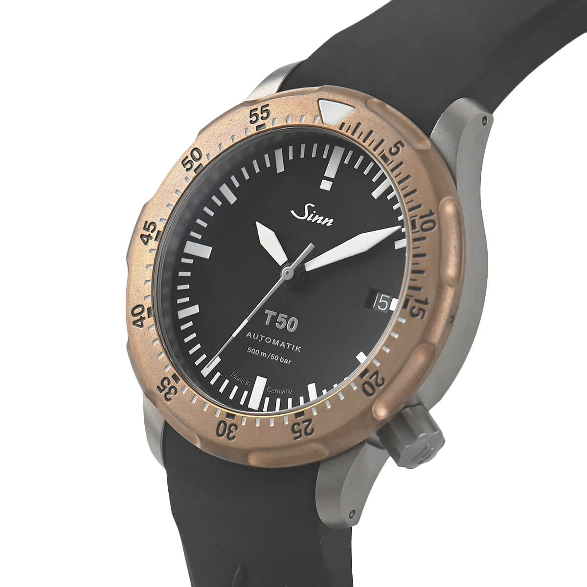 高い操作性と力強いデザインをコンセプトに設計された「T50」。特殊結合方式で固定されたセイフティーダイバーベゼルは、押して回さなければ回転しない誤回転防止構造を持ち、不意の衝撃でも外れることがなく、意図せず回転してしまうことがないようになっています。