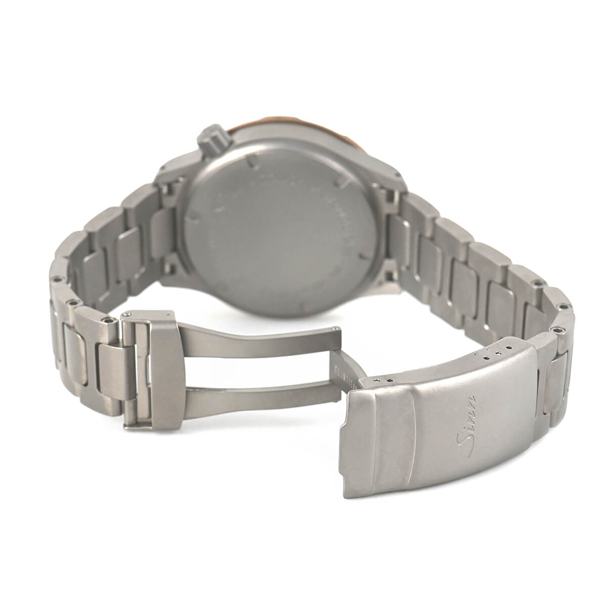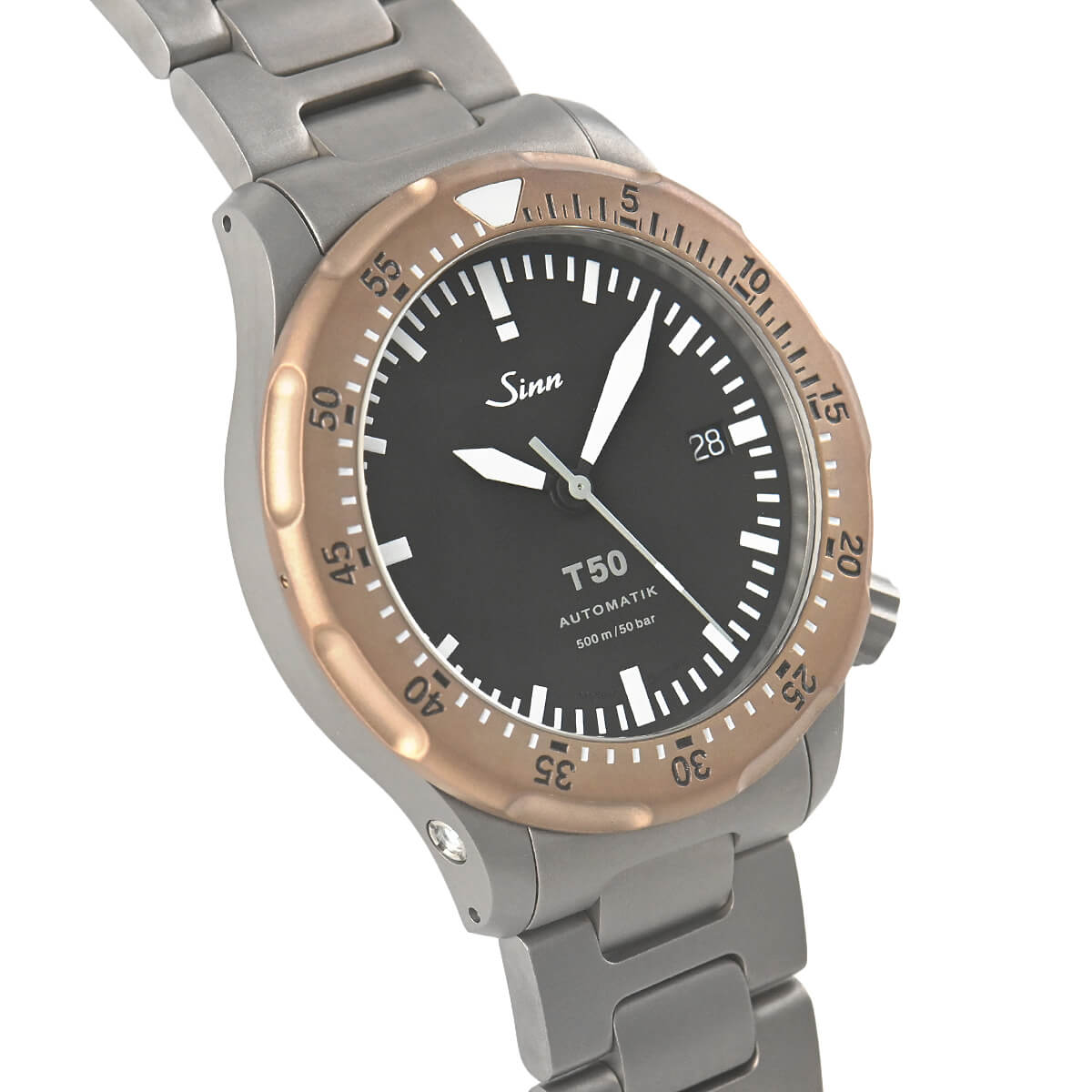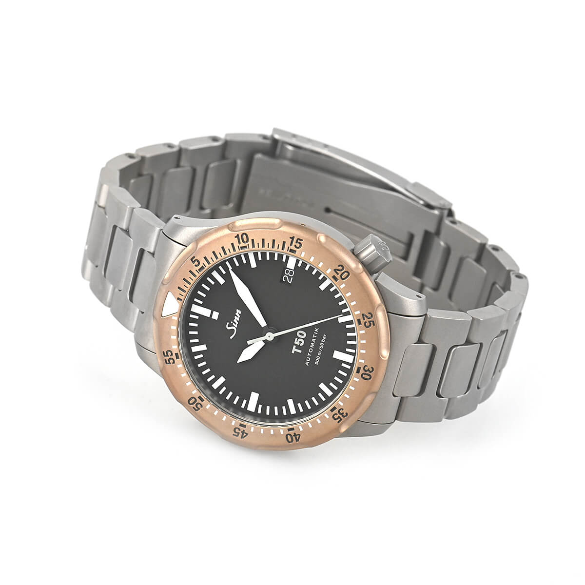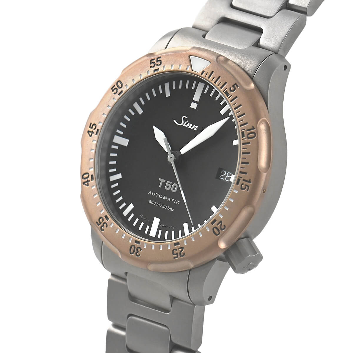 高い操作性と力強いデザインをコンセプトに設計された「T50」。特殊結合方式で固定されたセイフティーダイバーベゼルは、押して回さなければ回転しない誤回転防止構造を持ち、不意の衝撃でも外れることがなく、意図せず回転してしまうことがないようになっています。