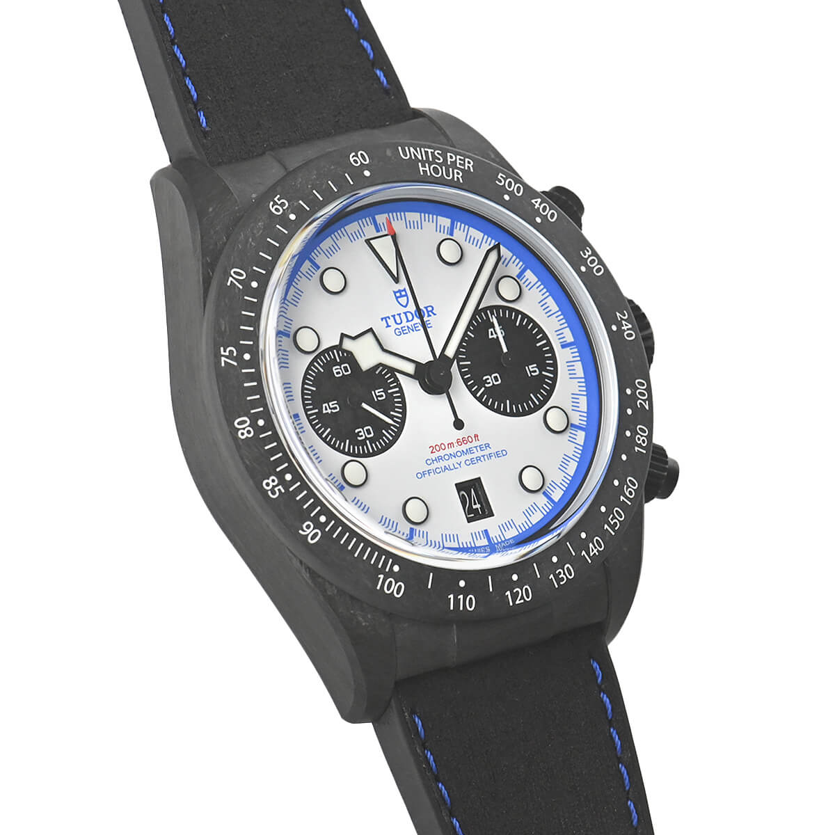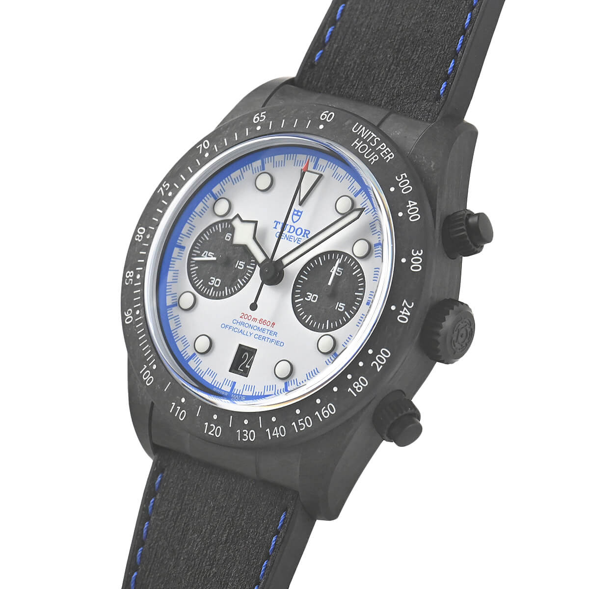 チューダーからクロノグラフモデルが発売されてから50周年を迎えたことを記念して作られた「ブラックベイクロノ」。こちらは、visa Cash App Racing Bulls F1チームのマシンのカラーリングを反映し、ブラックベイ クロノ “カーボン 25”は、進化し続けるチューダーのモータースポーツの歴史における重要な年にオマージュを捧げた2,025本、製造モデル。PVD仕上げのチタニウム製ケースバックには、一本一本に固有の番号が刻まれています。