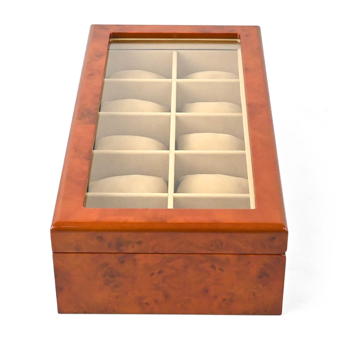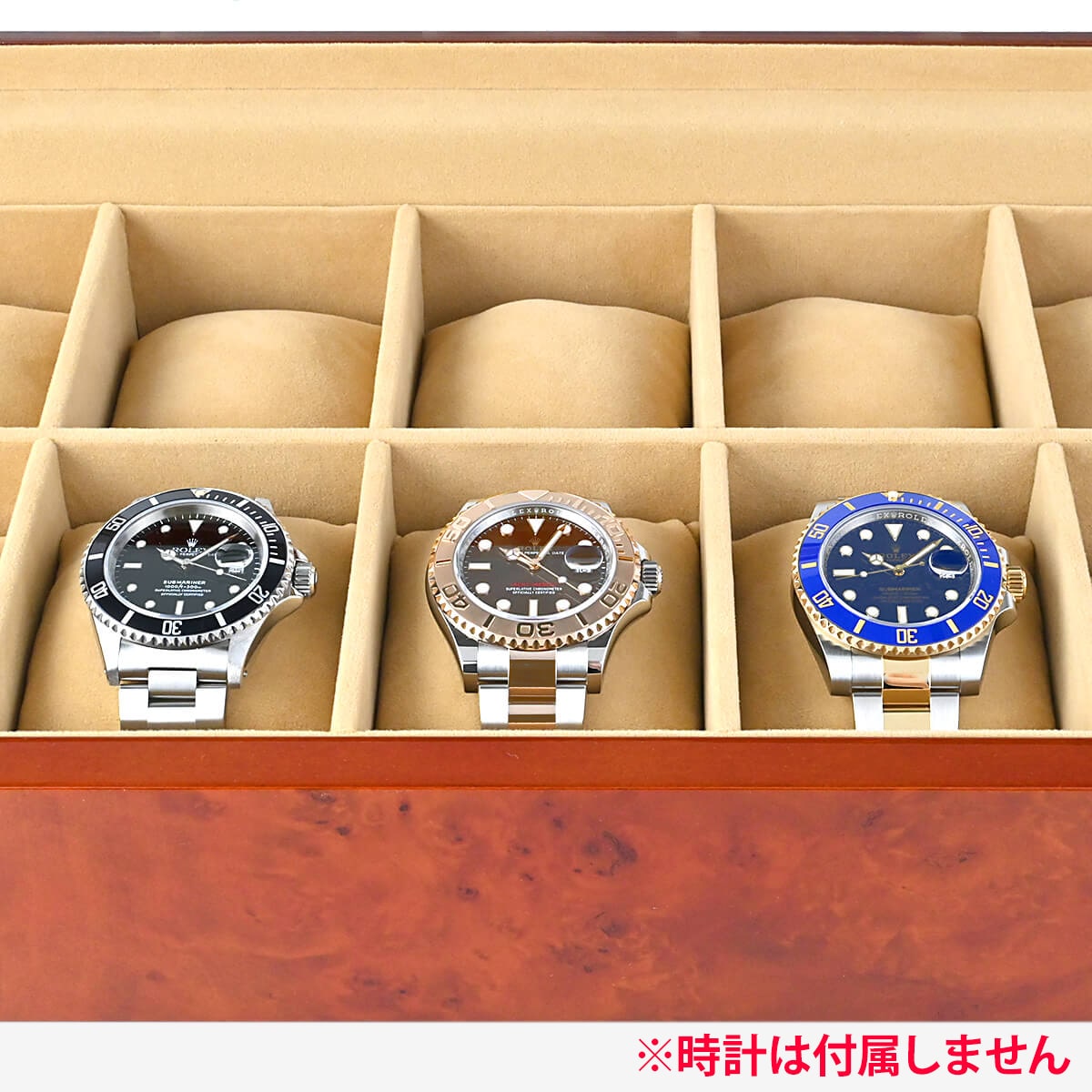 窓付きで収納した時計をそのまま鑑賞できる、10本用の腕時計ケースが入荷いたしました。本体は全体的に美しい木目調で仕上げられており、落ち着いた高級感を演出します。
