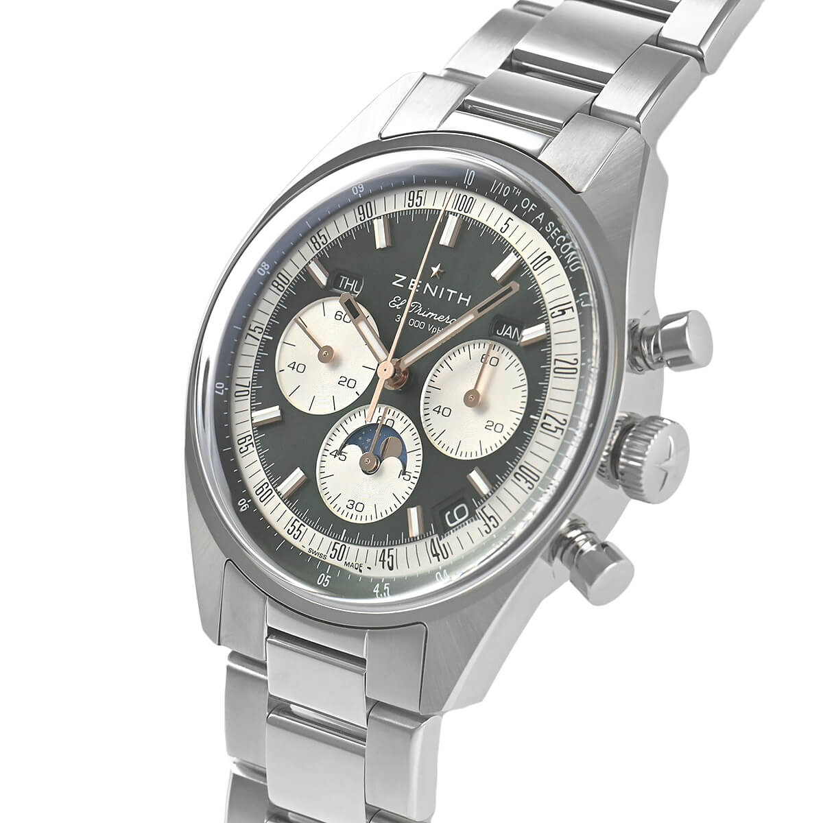 当時A386は38mmのステンレス製のケースにエル・プリメロMvを搭載しており、忠実にケースサイズも再現しております。キャリバーはEl Primero 3610 Automaticを搭載しており、1/10秒の時刻まで計測することが出来、トリプルカレンダームーン機能も搭載されております。