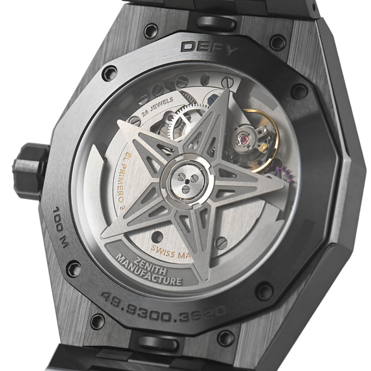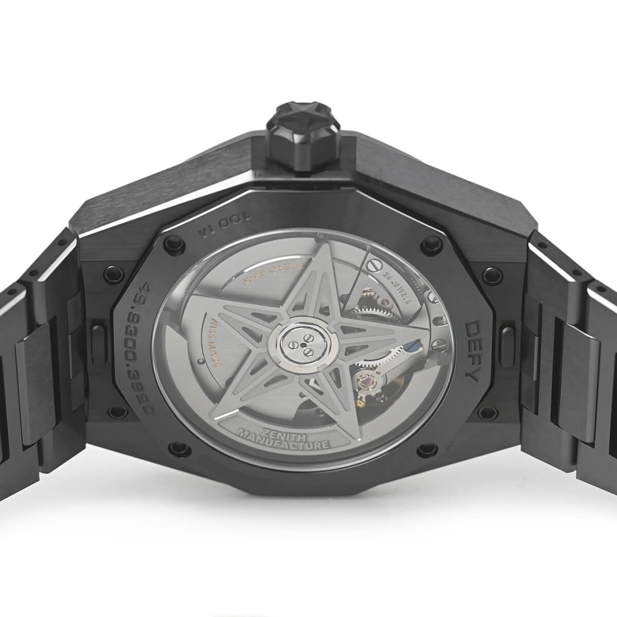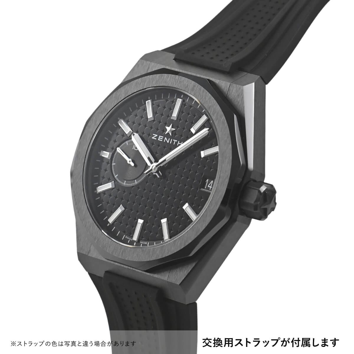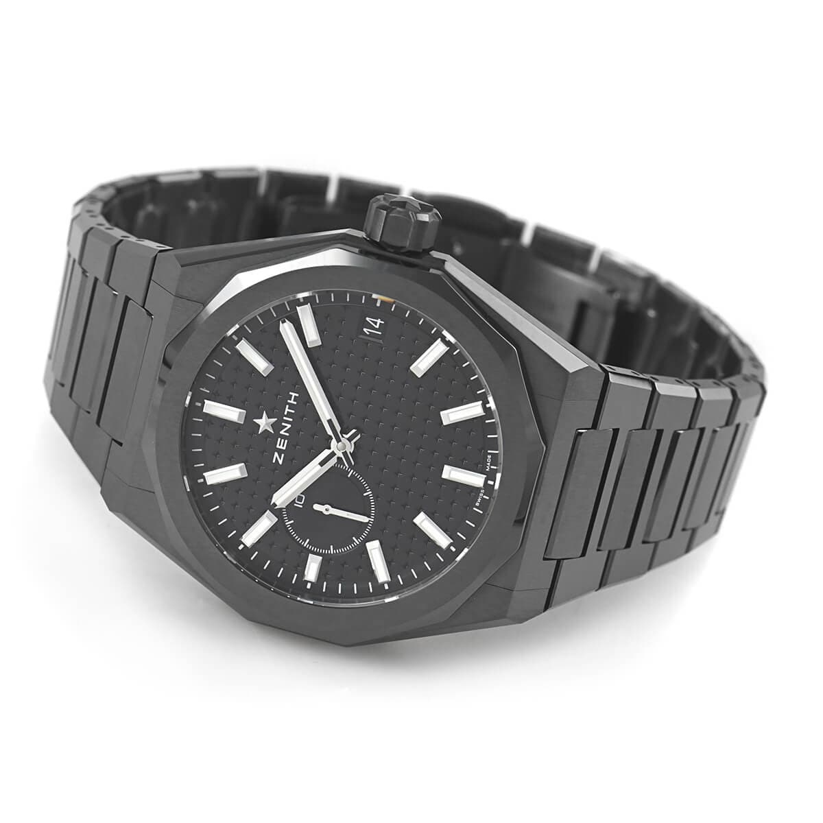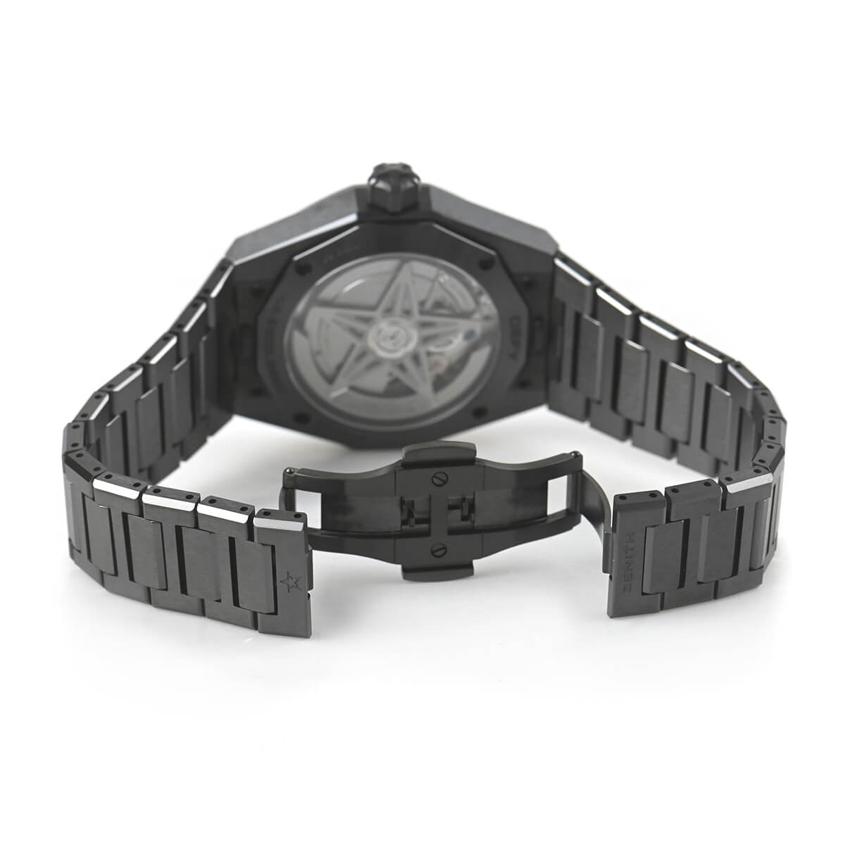 1865年の創設以来、150年以上も高い技術力で高精度の時計を生産し続けるスイスの名門マニュファクチュール「ゼニス」。歴史と伝統あふれるゼニスの理念を、自ら「THE FUTURE OF TRADITION」をテーマに、斬新なスタイルで覆したのがデファイ(反抗・立ち向かうの意味)コレクションです。八角形のブラックセラミックケースを使用し、ブラックトーンのサンバースト仕上げを施した文字盤にはゼニスの象徴である4つの点を結んだ星を復刻させてあしらっています。