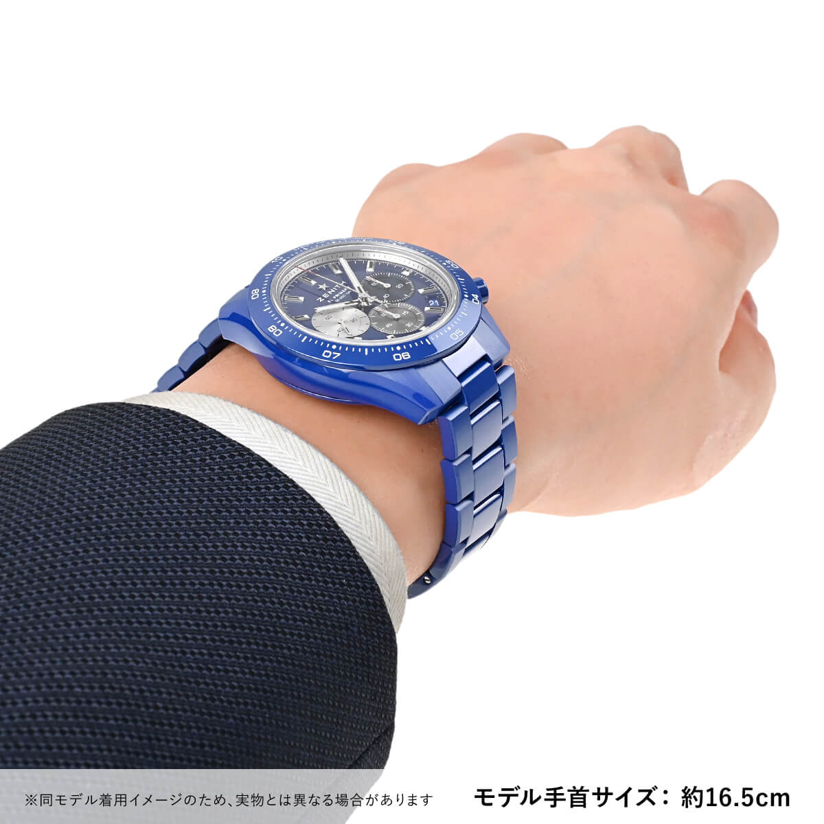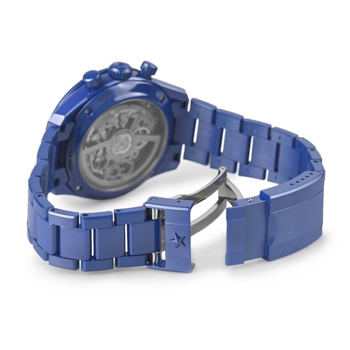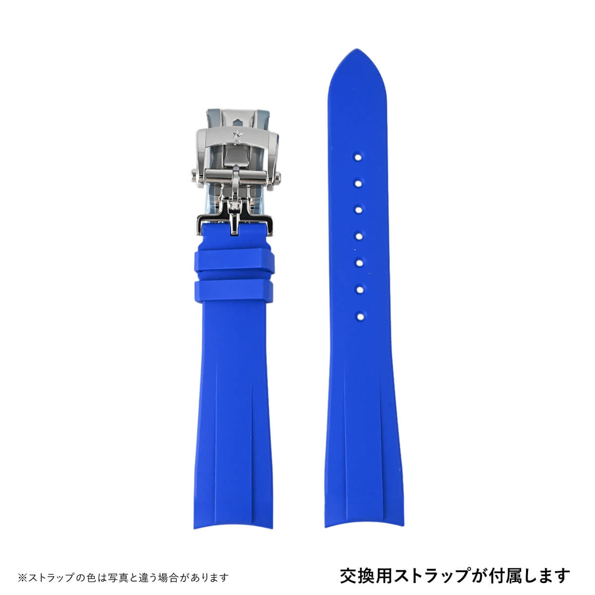 セラミック製フォールディングバックル付きのブルーセラミックブレスレットと、スチール製フォールディングバックル付きのブルーラバーストラップが付属します。
