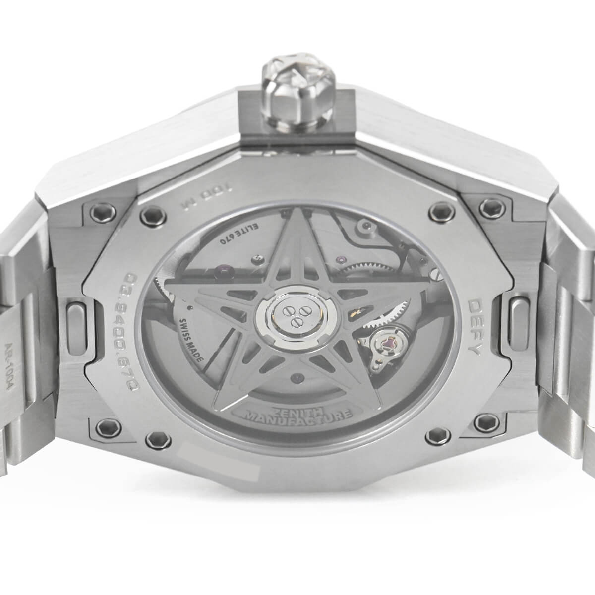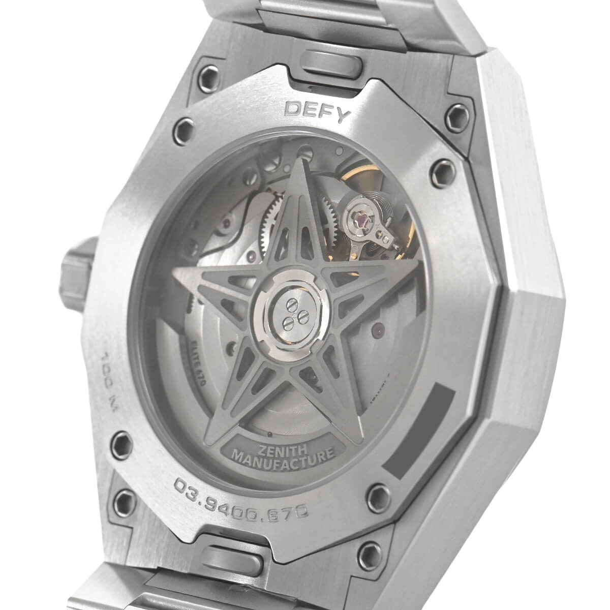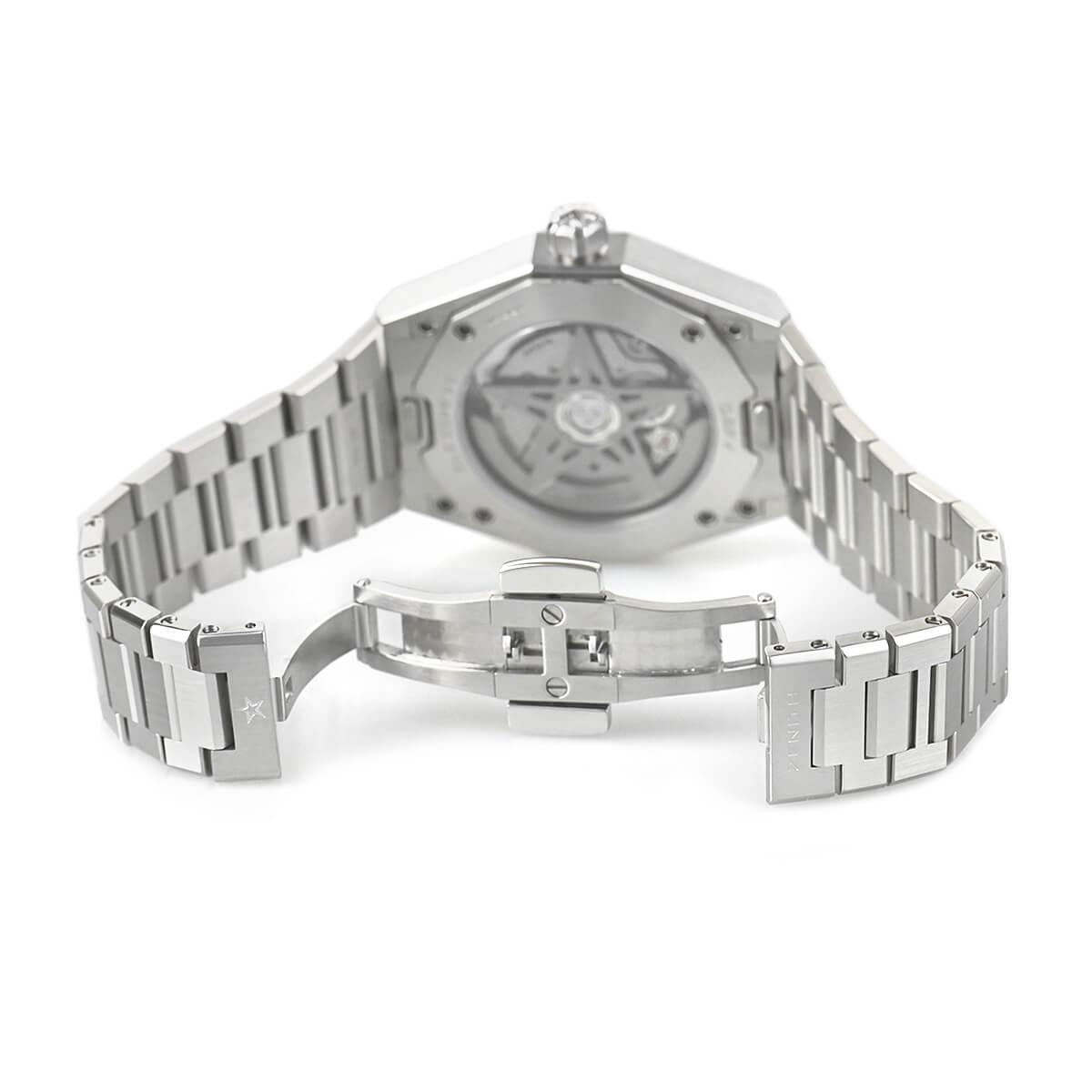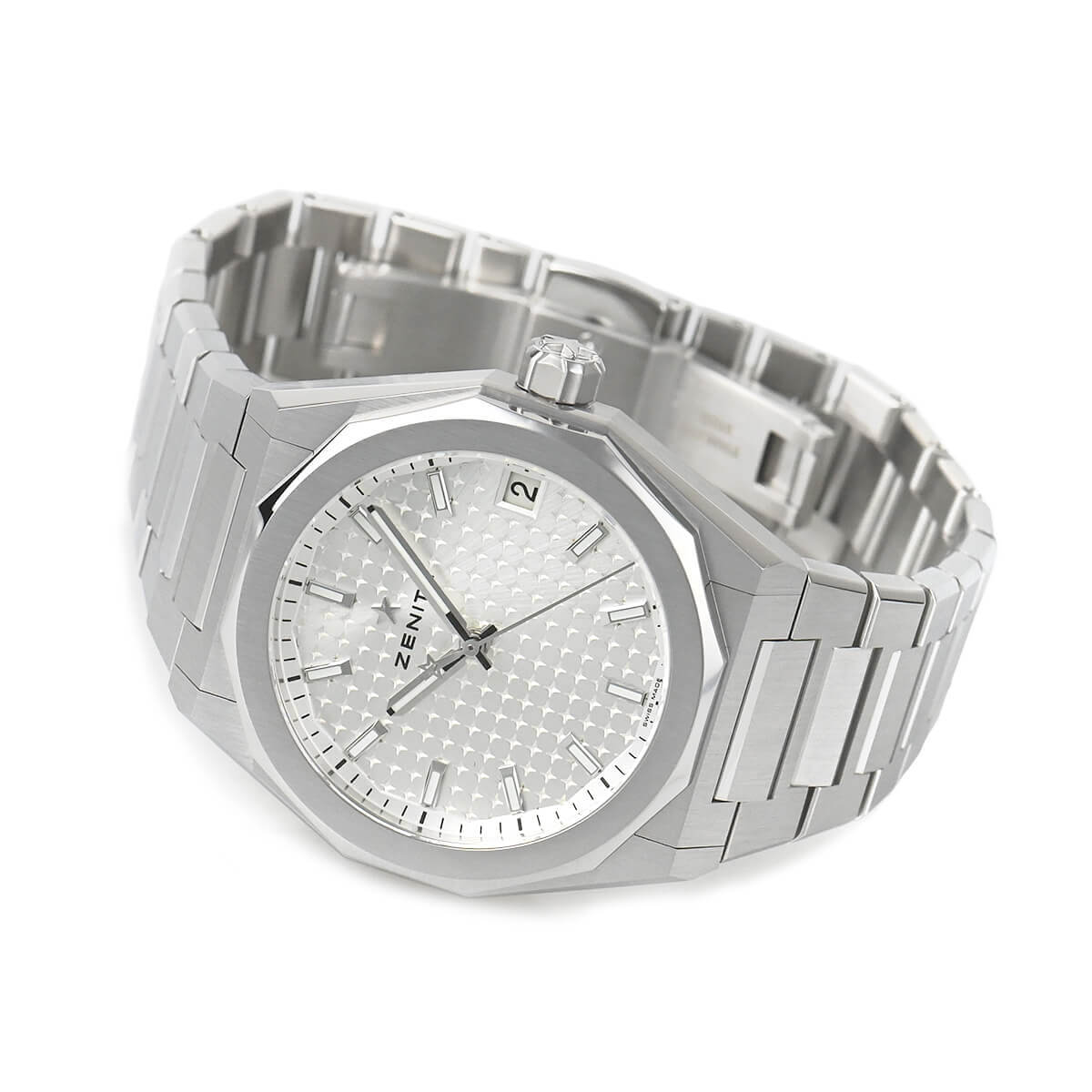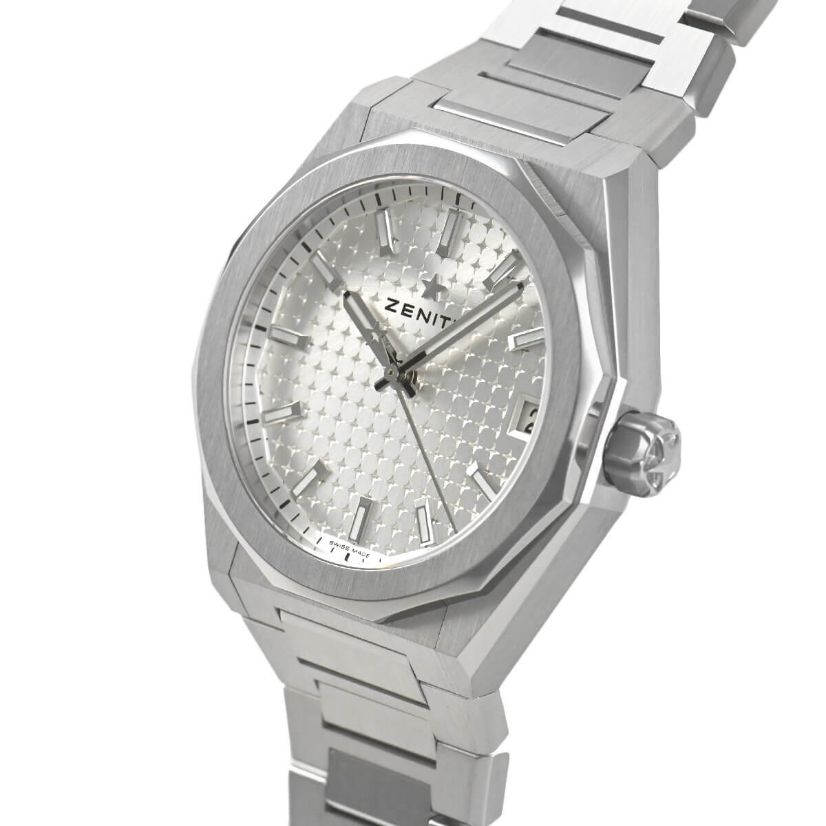 八角形のケースを使用し、シルバートーンのサンバースト仕上げを施した文字盤にはゼニスの象徴である4つの点を結んだ星を復刻させてあしらっています。