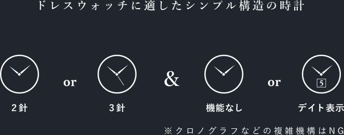 また、クロノグラフなど場にふさわしくない機能は避け、無機能もしくはデイト表示程度のシンプル構造のものを選ぶようにしましょう。