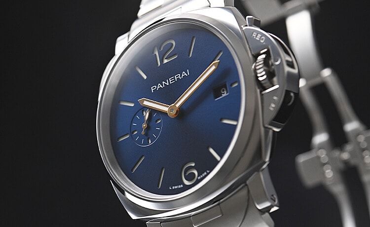 ドゥエ」。パネライを代表する「ルミノール」コレクションの第2世代として2016年からスタートした新しいコレクションで、パネライを象徴するリューズプロテクターを備えた伝統的なルミノール1950のデカ厚ケースから、約40%ボリュームダウンした現代的でスマートなスリムケースが特徴です。